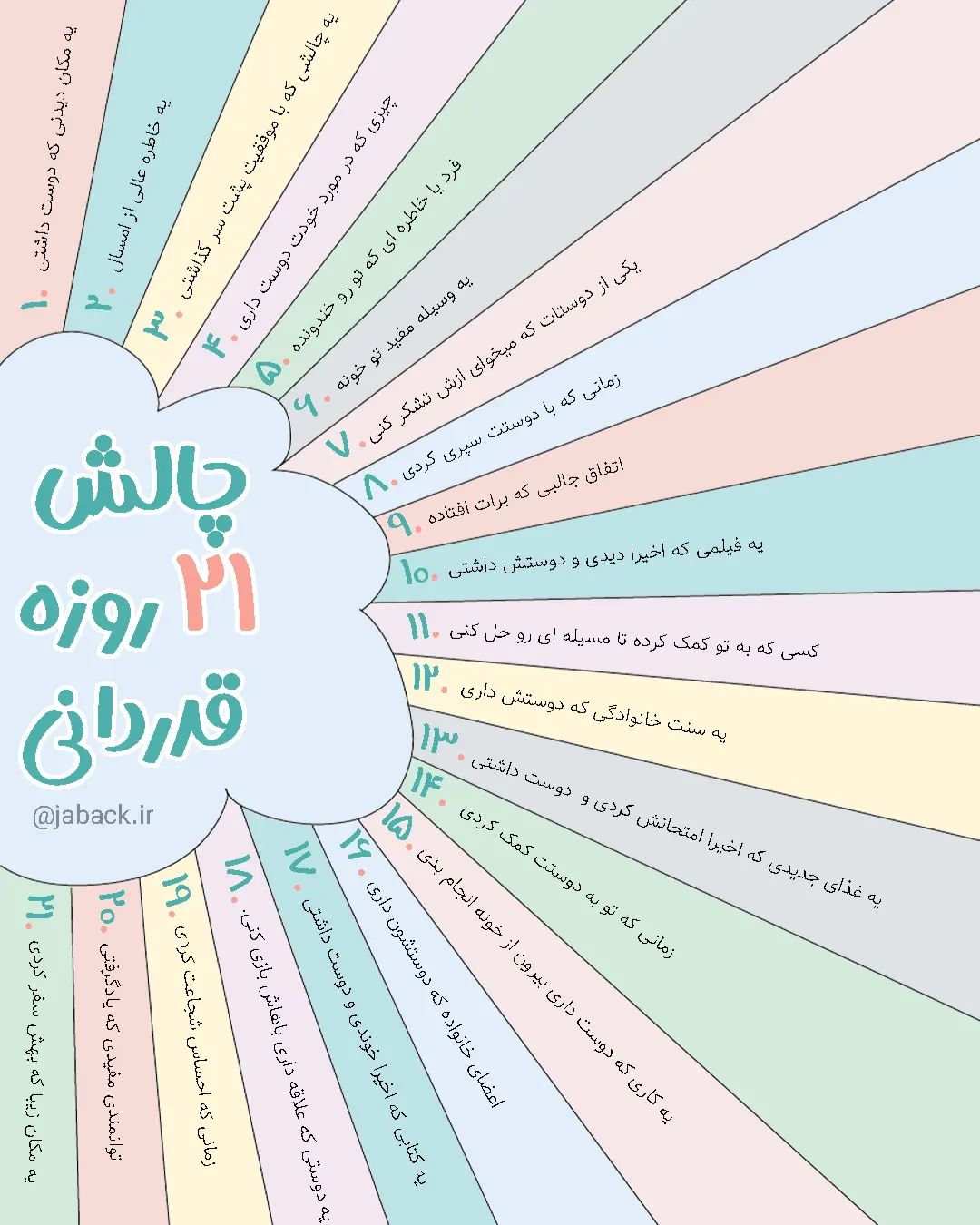 یه قاعده علمی اینه که ۲۱ روز اگه به کاری مداومت بشه تو مغز یه شیار مغزی به وجود میاد که اون فعالیت رو تبدیل به عادت میکنه.... خیلی از ما والدین میخوایم که با بچه ها صحبت کنیم اما نمیدونیم در مورد چی؟! خیلیامون چشم اندازمون اینه که بچه هامون قدردان داشته هاشون باشن اما ممکنه راهشو ندونیم... این چالش ۲۱ روزه کمک میکنه که این اهدافمون محقق شن و در کنارش هوش کلامی بچه هامونم زیاد میشه... با هم همراه شیم و هر شب ۱ مورد رو انتخاب کنیم و در موردش حرف بزنیم... . ⁉️شما با بچه ها در مورد چه موضوعاتی حرف میزنید ؟⁉️ . . 🔴❗️میتونید فایل بی رنگ این جدول رو از قسمت بیو پیج دانلود کنید پرینت بگیرید توی اتاق بچه ها بچسبونید و هر کدوم رو که انجام دادین رنگش کنید 🤩 روی لینک بیو کلیک کنید. قسمت فایل قابل پرینت رو بزنید و دانلود کنید عکس با کیفیت رو😍 #چالش #چالش_خانوادگی #تربیت_فرزند #کودک #کودک_شاد #کودک_سالم #گفت_وگو_کودک #گفتگو #گفتاردرمانی_کودکان #روانشناسی_کودک #اعتماد_به_نفس_کودک #عزت_نفس_کودک #فرزند_پروری #والدگری #رشدکودک #خلاقیت_کودک