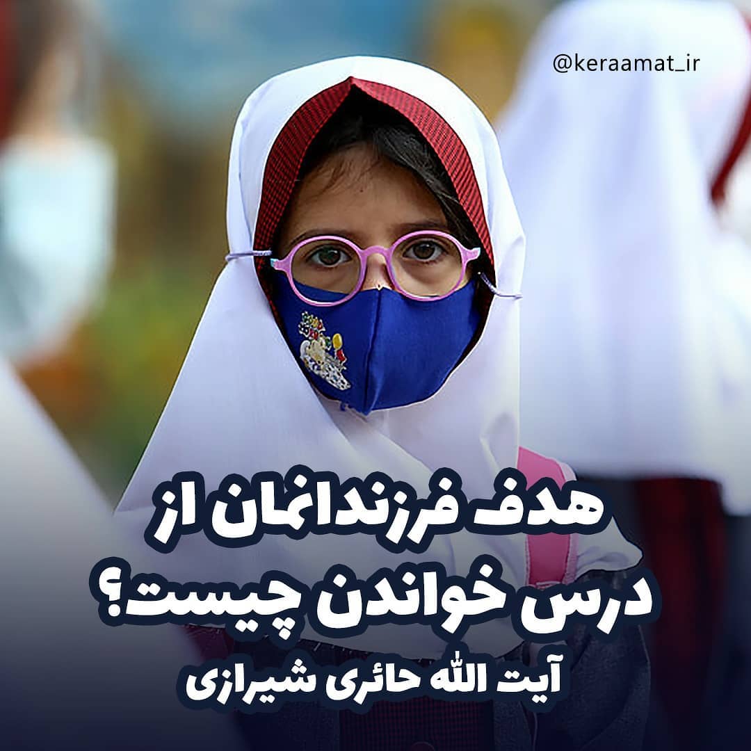 هدف فرزندانمان از درس خواندن چیست؟ #آیت_الله_حائری_شیرازی در ذهن دانش آموز دنیا و آخرت نباید به عکس هم ترسیم شوند او باید متوجه شود که خط آخرتی هر فرد در مسیر دنیایی او رقم میخورد.😇 باید برای کودک روشن شود که دنیا معبر است و از آن خارج خواهد شد🤔 وقتی میخواهید ببینید که فرد تحت تربیت، خود را مسافر میداند یا خیر، از نیت او سوال کنید.🧐 از او سوال کنید برای چه درس میخواند؟ مثلا اگر بگوید برای خوشحالی پدر و مادر درس میخوانم، عملش دنیایی است.😯 آیت الله حائری شیرازی تربیت دینی کودک صفحه 110 و 112 #کرامت_نوشت کودک به دنبال جلب رضایت پدر و مادر و معلمین خود است و تصوری از خدا و پیامبر و امامان و رضایت آنان ندارد. اما باید به تدریج او را با اولیاء بزرگتری مثل ولی جامعه، شهدا، پیامبران و امامان آشنا کرد، تا کودک نیت اعمال خود را رضایت و نزدیکی به آنان قرار دهد. ممنون که با نظرات و لایکهاتون از ما حمایت میکنید🙏❤❤
