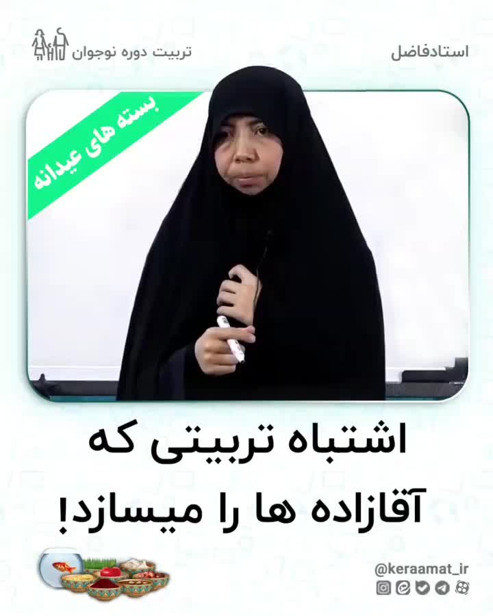 . "بسته های عیدانه، ثبت نام در سایت کرامت" 🎁🎁بسته آشنایی با کلیات تربیت دینی فرزند 📍 اشتباه تربیتی که آقازاده ها را می سازد! . ✅ طبق روایتی اگر میخواهیم مجاهده کنیم، یک راه آن تمرین گرسنگی و تشنگی. آیت الله جاودان در شرح این روایت میفرمایند، منظور فقط روزه گرفتن نیست. بلکه هیچ لزومی ندارد هر زمان تشنه و گرسنه شدیم، همان لحظه آب و غذا بخوریم. این را با نوجوانان تمرین کنیم. علاوه بر این، گفته شده هر وقت شروع به غذا خوردن کردیم هم تا سیر نشدیم، دست از غذا بکشیم. ما فکر میکنیم اینها آداب غذا خوردن است، در حالی که اینها آداب انقلابیگری است. پدیده تربیتی آقازادهها از اینجا شروع میشود که چون همیشه در رفاه بودند به راحتی میتوان آنها را تهدید و تطمیع و تحمیق کرد. 🔖خانم دکتر فاضل. 📚تربیت دخترانه. . 📌ما در کرامت، برایتان از اندیشه های مختلف تربیتی می گوییم، چراکه نگاه نقادانه ی شما ارزشمند است. . . . . . . . #کرامت #فاضل #تربیت #روزه #نوجوان #رقیه_فاضل #خانواده #تربیتی #آموزشی