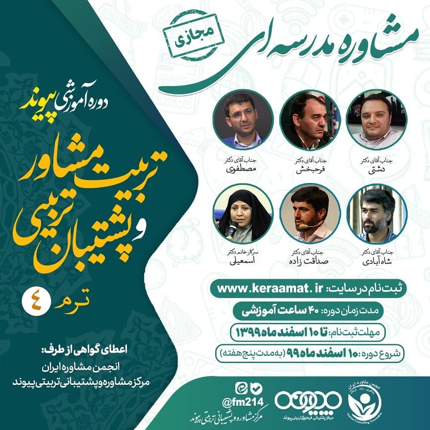 💡 *دوره مجازی مشاوره مدرسه ای 🔻 مرکز تربیت مشاور و مشاور تربیتی پیوند با همکاری انجمن مشاوره ایران برگزار میکند. 🔸 پشتیبانی در پیامرسان بله، نام کاربری @fm214 🔸️امکان شرکت برای علاقمندانی که در ترم های گذشته حضور نداشته اند، نیز وجود دارد. ⛔️ مهلت ثبت نام تا ۱۰ اسفندماه 🌐اطلاعات بیشتر و ثبت نام در: www.keraamat.ir ✅ @keraamat_ir