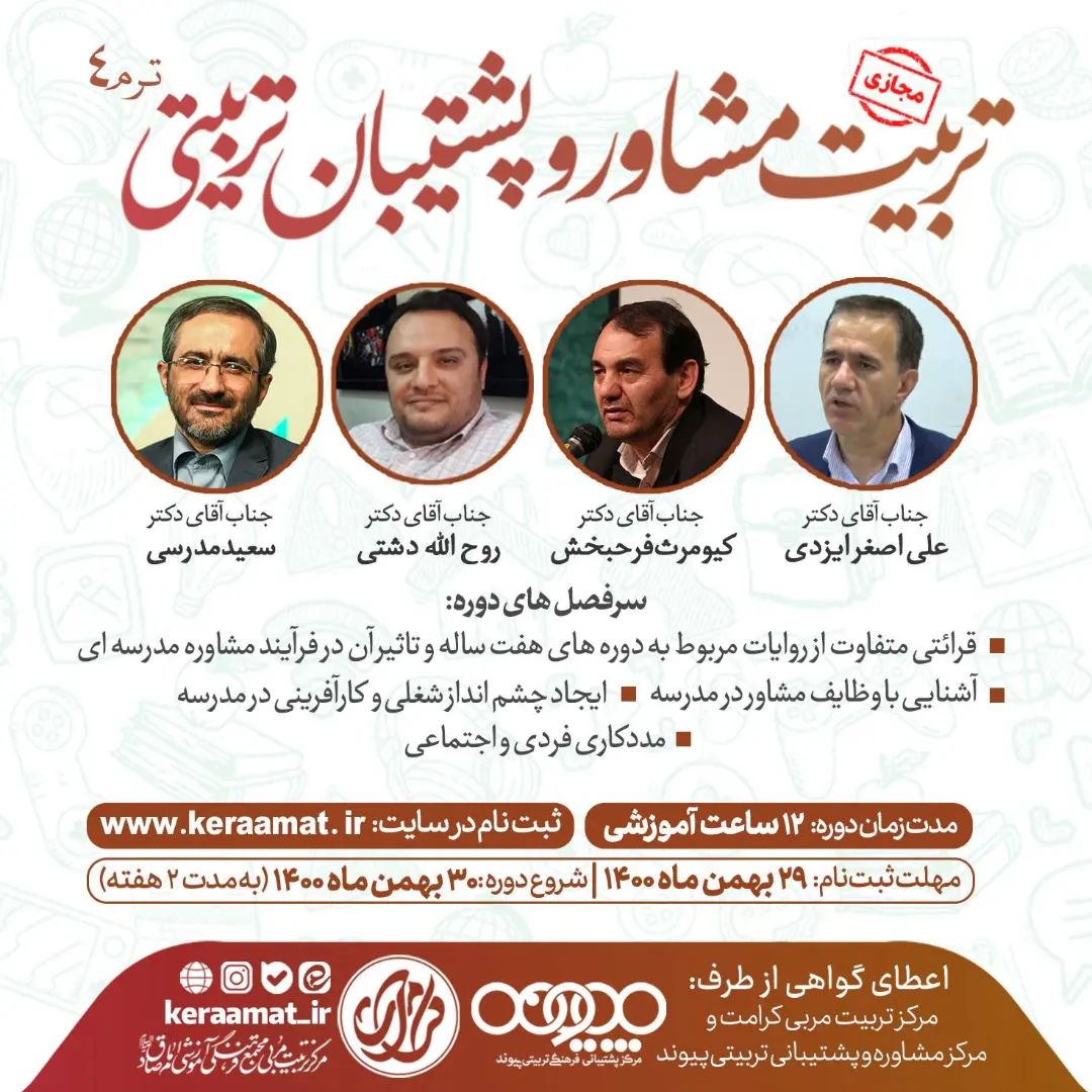 💡 *دوره آموزش مجازی تربیت مشاور و پشتیبان تربیتی پیوند (ترم۴)* 🔸 ۱۲ ساعت آموزشی طی ۲ هفته ⛔️ مهلت ثبت نام: ۲۹ بهمن 📌 همراه با اعطای گواهی از طرف مرکز کرامت و مرکز مشاوره و پشتیبان تربیتی پیوند 🔆 *ارائه کد تخفیف به شرکت کنندگان دوره های گذشته کرامت، مادران دارای سه فرزند و بیشتر، طلاب و دانشجویان* 🔆 دریافت کد تخفیف در پیام رسان بله و ایتا با نام کاربری @keraamat_majazi یا شماره 09021818022 🌐 اطلاعات بیشتر و ثبت نام در www.keraamat.ir ✅ @keraamat_ir #کرامت #دوره_آموزشی #مشاوره #تربیت_مشاور #تربیت #آموزش_مجازی