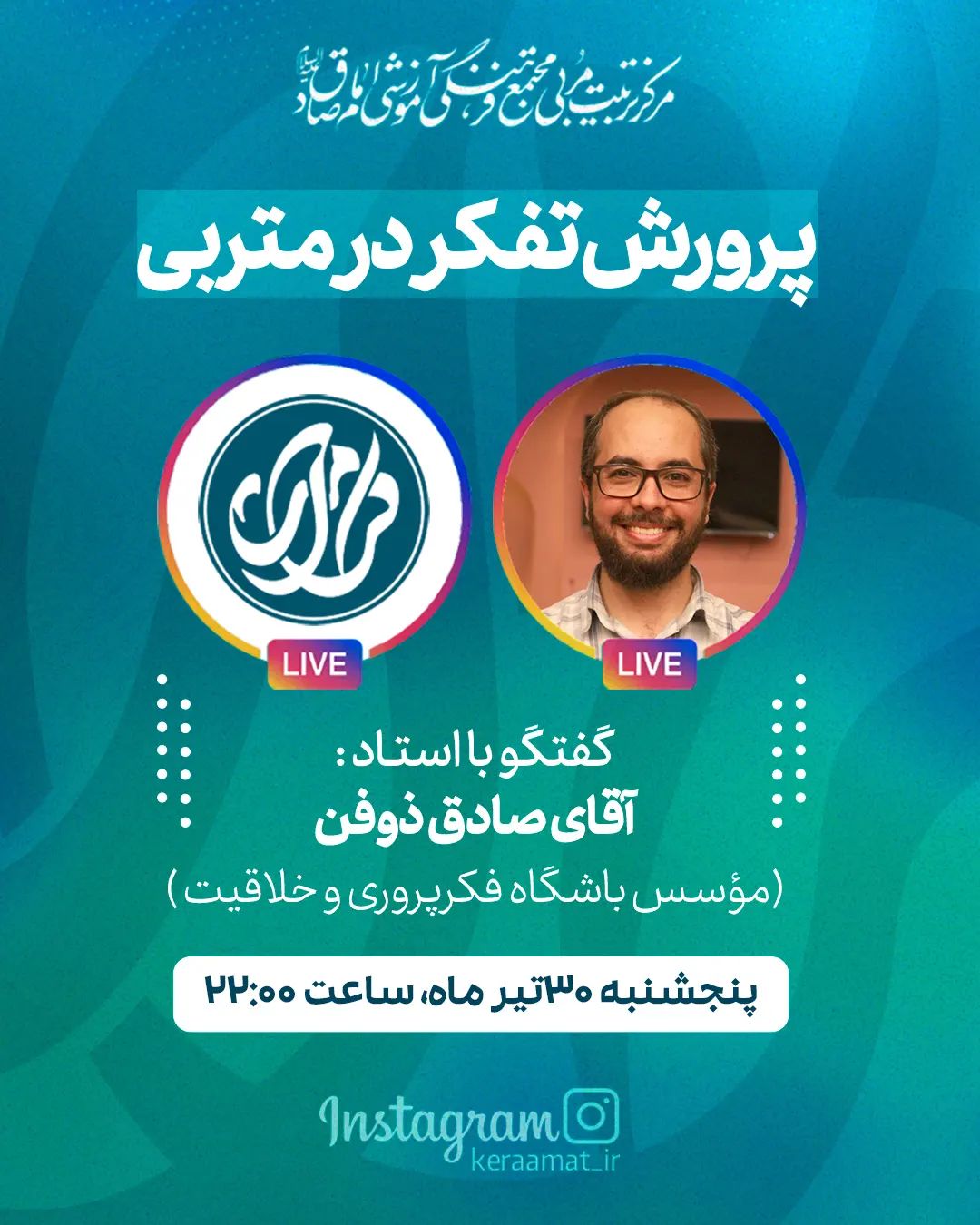 . 📌گفتگوی زنده در این گفتگو در خدمت آقای صادق ذوفن هستیم با موضوع پرورش تفکر در بچه ها چه کنیم تا فرزندانی اهل تفکر داشته باشیم؟ پنجشنبه ساعت ۲۲ با ما همراه باشید @keraamat_ir #کرامت #تربیت #نوجوان #لایو #گفتگوی_زنده #تفکر #اندیشه