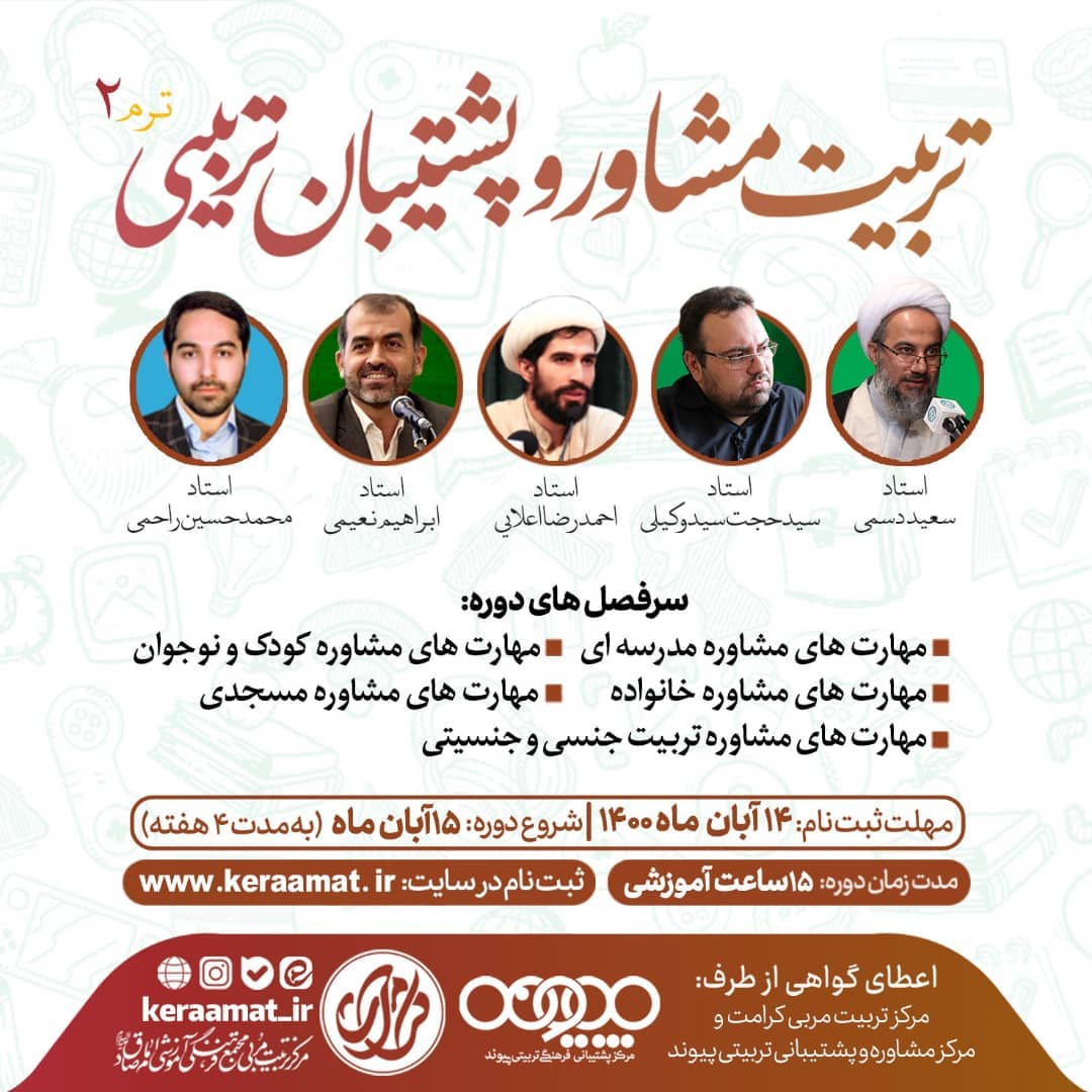 💡 *دوره مجازی تربیت مشاور و پشتیبان تربیتی پیوند/ ترم دوم* 🔸 ۱۵ ساعت آموزشی طی ۴ هفته ⛔️ شروع دوره: ۱۵ آبان 📌همراه با اعطای گواهی معتبر از سوی مرکز تربیت مربی مجتمع امام صادق (ع) و مرکز مشاوره و پشتیبانی تربیتی پیوند 🌐 اطلاعات بیشتر و ثبت نام در www.keraamat.ir ✅ @keraamat_ir . . . . . . #مشاور #مشاوره #پیوند #دوره_آموزشی #مرکز_مشاوره #آموزش_مشاوره #مشاور_کودک #مشاوره_آنلاین #مشاوره_مجازی #آموزش_مجازی