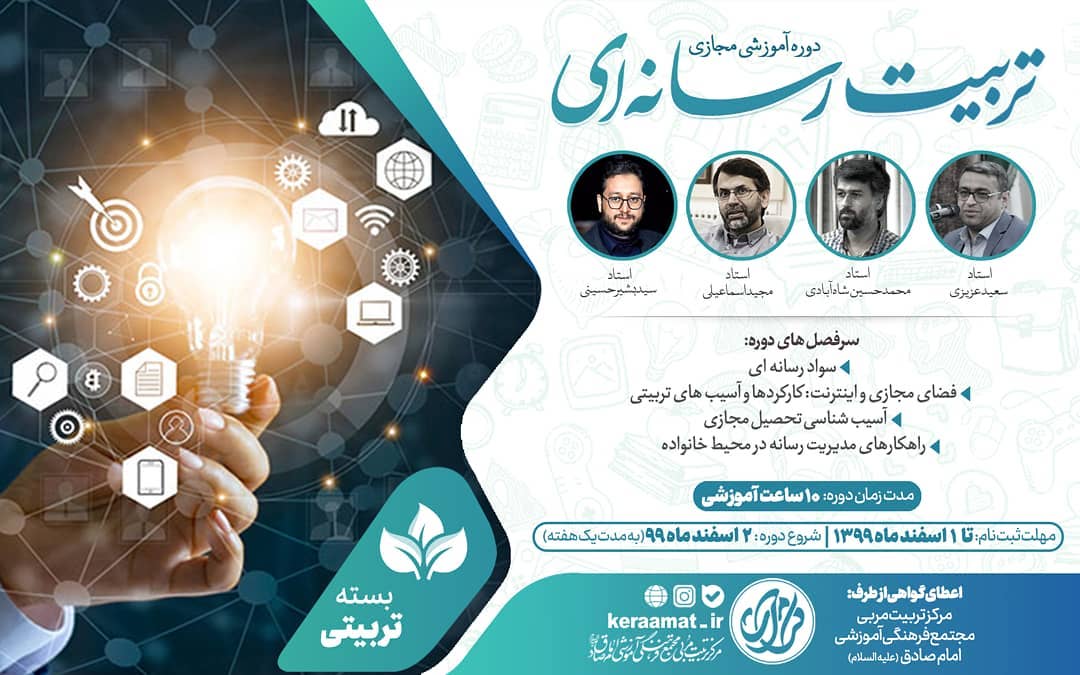 🔻دوره مجازی تربیت رسانه ای 🔸 ۱۰ ساعت آموزش مجازی در یک هفته 🔸 جلسات به صورت ضبط شده است و برخط نیست. 🔆 سرفصل ها 🔸 راهکارهای مدیریت رسانه در محیط خانواده 🔸آسیب شناسی تحصیل مجازی 🔸 فضای مجازی و اینترنت، کارکردها و آسیب های تربیتی 🔸 هزینه دوره: ۹۰ تومان 🔸 ثبت نام از طریق www.keraamat.ir