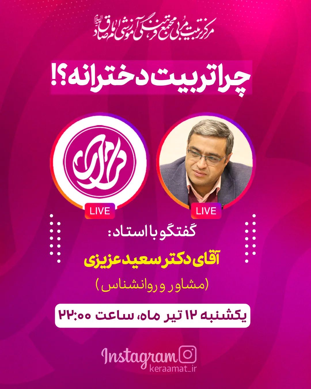 📌گفتگوی زنده در این گفتگو در خدمت آقای دکتر عزیزی هستیم با موضوع ضرورت و اهمیت تربیت دخترانه از منظر روانشناسی آیا تربیت دختران و پسران تفاوت دارد؟ یکشنبه ساعت ۲۲ با ما همراه باشید @keraamat_ir #کرامت #تربیت_دخترانه #نوجوان #لایو #گفتگوی زنده #دکتر_عزیزی #دختر