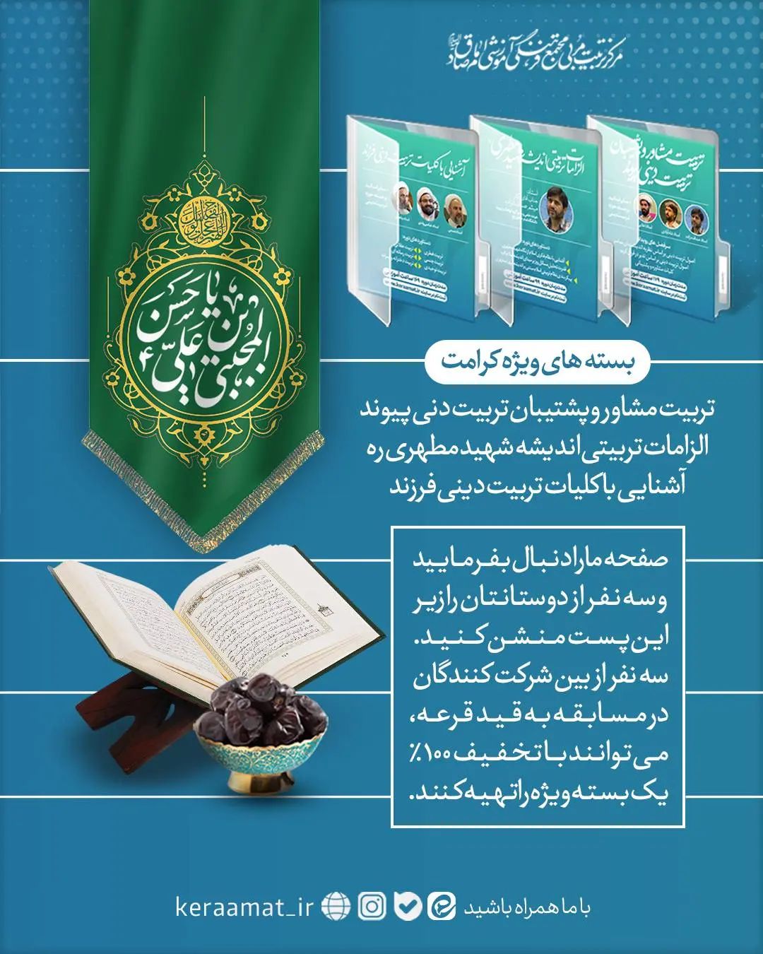 . 📍قرعه کشی بمناسبت میلاد امام مجتبی صفحه ما رو دنبال کنید و سه نفر از دوستانتون رو زیر این پست منشن کنید سه نفر ز بین شرکت کنندگان در مسابقه به قید قرعه میتوانند با تخفیف ۱۰۰٪ یک بسته ویژه را تهیه کنند . . . #مسابقه #امام_حسن #تخفیف #عیدی #رمضان #روزه #افطار #تربیت #آموزش #تربیت_دینی