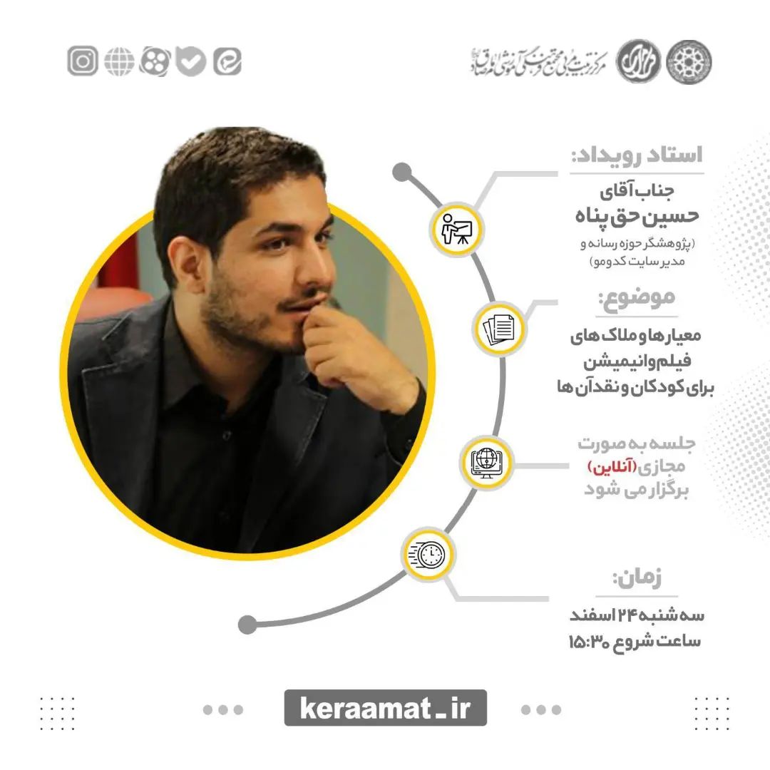 💡 *رویداد آموزشی برخط (آنلاین) معیار ها و ملاکهای فیلم و انیمیشن و نقد آنها * 🕰 زمان برگزاری: سه شنبه ۲۴ اسفند ساعت ۱۵:۳۰ 📌 این رویداد به صورت برخط (آنلاین) برگزار میشود 🌐 اطلاعات بیشتر و ثبت نام در www.keraamat.ir ✅ @keraamat_ir #کرامت #تربیت#آموزش #فیلم #انیمیشن #حق_پناه