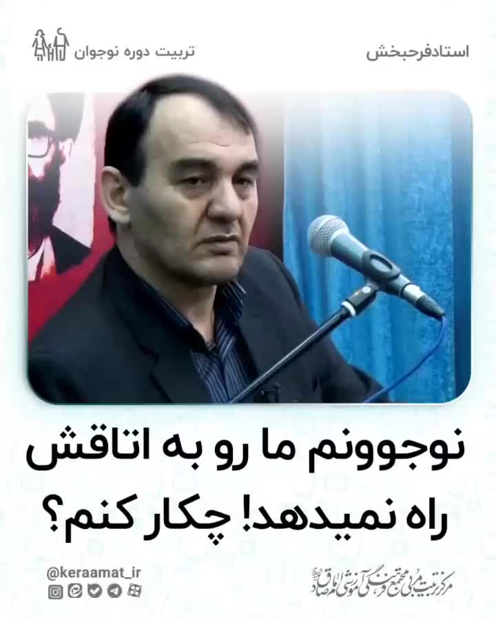 . 📍نوجوونم ما رو به اتاقش راه نمیدهد! چیکار کنم؟ . گاهی پدرها و مادرها دوست دارند با نوجوانشان ارتباط برقرار کنند، اما نوجوانها دوست ندارند ارتباطی با پدر و مادر داشته باشند. مثلا وارد خانه میشوند، به اتاقشان میروند و نمیگذارند پدر و مادر وارد اتاق آنها شود. در این حالت پدر و مادر میتوانند میوهای را به اتاق نوجوان بروند و بگویند ما میخواهیم در کنار تو میوه بخوریم، ذوق این را داریم که کنار تو باشیم، قهر تو هم برای ما لذت بخش است. با او شوخی کنیم، پرخاشگریهای او را طبیعی تلقی کنیم و فکر نکنیم به دلیل بی تربیتی این کار را میکند. یا مثلا اگر نوجوان دوست ندارد همراه ما به سفر بیاید، بگوییم چون تو نمیآیی، ما هم نمیرویم و اینکه در خانه در کنار تو باشیم بیشتر به ما خوش میگذرد. لازم است «صبر کنیم» و این کار را آنقدر ادامه دهیم تا نتیجه دهد. البته لازم است توجه کنیم این کار ممکن است ظرف یک هفته جواب ندهد و گاهی یک یا دو سال باید چنین رفتاری را داشت و رفتارهای محبت آمیز را با بچه تداوم داد، تا نوجوان با ما انس بگیرد. . . . ⭕️فکر میکنید چرا نمیتونیم ارتباط با نوجوونمون رو درست شکل بدیم؟ . . . 🔖دکتر کیومرث فرحبخش. . 🔻ما در کرامت، برایتان از اندیشه های مختلف تربیتی می گوییم، چراکه نگاه نقادانه ی شما ارزشمند است.🔻 . . . . . . . #فرحبخش #کرامت #نوجوان #تینیجر #دوستی #خانواده #قدس #تربیت_فرزند #استقلال #چالش #سبک_زندگی