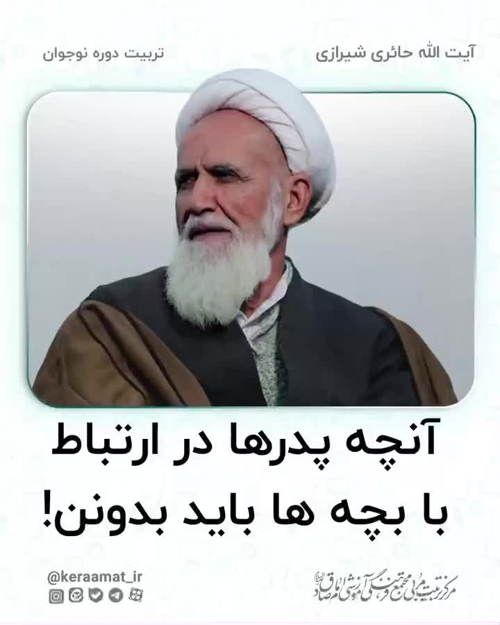 . 📍انچه پدر ها در ارتباط با بچه ها باید بدونند؟ پدر باید با بچه رفیق و هم بازی باشد و رفیق اول بچه باشد. بچه باید بتواند با پدرش راحت حرف بزند. اگر پدری رفیق اول فرزندش نباشد، هر چه پدر میگوید میرود با رفیق اولش طرح میکند اگر او تایید کرد میپذیرد، و گرنه تایید نمیکند. بچه اگر عاشق پدر نباشد، عاشق دین پدر نمیشود. 🔖آیت الله حائری شیرازی 📌ما در کرامت، برایتان از اندیشه های مختلف تربیتی می گوییم، چراکه نگاه نقادانه ی شما ارزشمند است. #حائری_شیرازی #عاشق #پدر #رفیق #همبازی #بازی #دین #حرف #تایید #طرح
