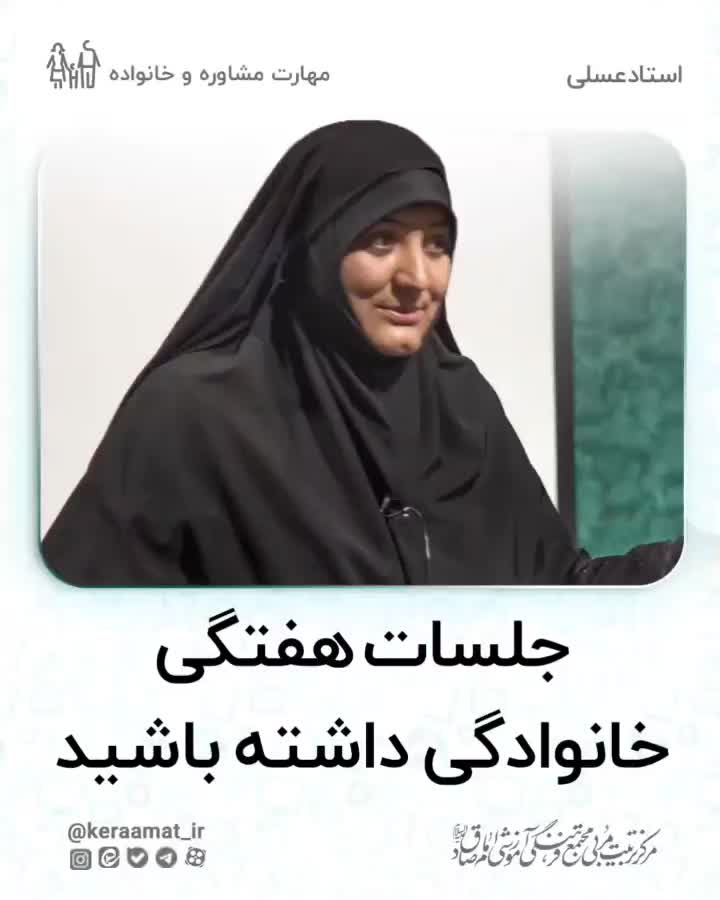 🔻جلسات هفتگی خانوادگی داشته باشید لازم است در خانه جلساتی تحت عنوان جلسات هفتگی وجود داشته باشد تا اعضای خانواده با هم قواعد و قوانین را تنظیم کنند. در هر نشست، یکی رئیس و دیگری دبیر جلسه باشد و موضوعی که در هر هفته لازم است بررسی شود از قبل برنامه ریزی شود. بچهها هم از ۴ سالگی میتوانند وارد این جلسه شوند. مثلاً دستور جلسه یک هفته برنامه مسافرت یا ساعت خواب خانواده باشد. اینکه مکان سفر، ساعت حرکت و برنامه طی سفر به شکل باشد؟ یا در مورد ساعت خواب، مثلا پدر و مادر ساعت 9 را به عنوان ساعت خواب اعلام میکنند و بچهها دوست دارند دیرتر و در ساعت 10 بخوابند. در جلسه راجع به آن صحبت شود و مثلا والدین میگویند، ما یک امتیاز میدهیم و یک امتیاز میگیریم و در مجموع به این تصمیم میرسند که ساعت 9:30 ساعت خواب باشد. . . . ⭕چقدر مقید به جلسات خانوادگی هستید؟ . . . 🔖خانم دکتر عسلی. 📚دوره تربیت مشاور و پشتیبان تربیتی. ترم یک. . 🔻ما در کرامت، برایتان از اندیشه های مختلف تربیتی می گوییم، چراکه نگاه نقادانه ی شما ارزشمند است.🔻 . . . . . . . . #عسلی #دکتر عسلی #جلسه_خانوادگی #مسافرت #خانواده #والدین #کرامت #خلاقیت #گفتگو #تربیت