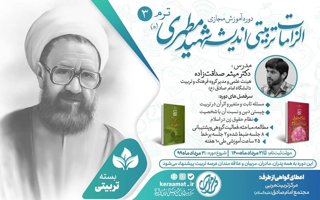 💡 الزامات تربیتی اندیشه شهید مطهری. ترم سوم ⛔️ شروع ترم سه: ۲۱ مرداد 🔸 سرفصل ها: ۱. اسلام و نیازهای زمان ۲. نظام حقوق زن در اسلام 🔆 ۸جلسه ضبط شده و ۲ جلسه برخط طی ۱۰ هفته 📍 پشتیبانی در پیام رسان بله و ایتا با نام کاربری @keraamat 🌐اطلاعات بیشتر و ثبت نام در: https://www.keraamat.ir/product/elzamat-term-sevom/