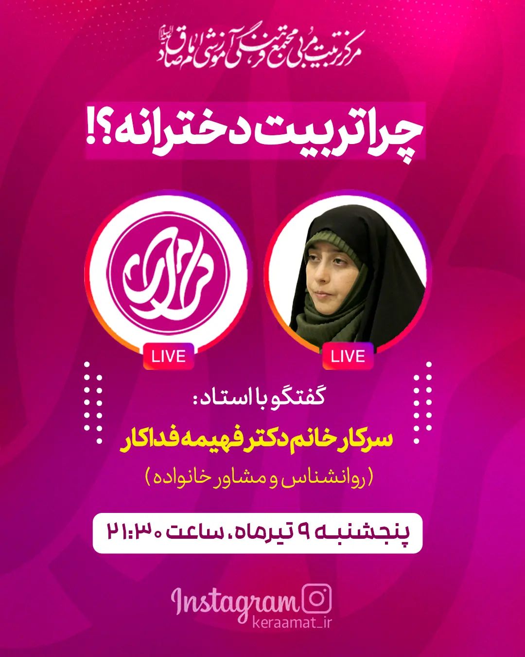 . 📌گفتگوی زنده با موضوع ضرورت و اهمیت تربیت دخترانه از منظر روانشناسی آیا تربیت دختران و پسران تفاوت دارد؟ امشب در خدمت خانم دکتر فداکار هستیم، تا در رابطه با اهمیت تربیت دخترانه گفتگو کنیم امشب ساعت ۲۱.۳۰ با ما همراه باشید @keraamat_ir #کرامت #تربیت_دخترانه #نوجوان #لایو #گفتگوی زنده #دکتر_فداکار #دختر