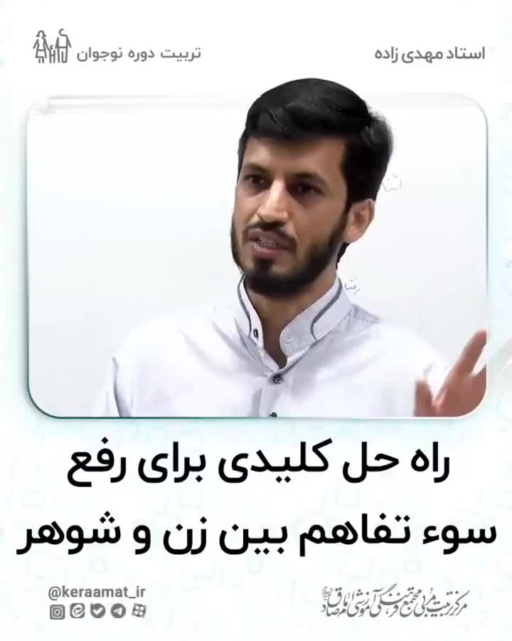 🔻راه حل کلیدی برای رفع سوتفاهم بین زن و شوهر . غیرت نوعی ابراز محبت در مردان است و محبت نسبت به همسر در مردان، خود را در مقام غیرت نشان میدهد. اگر دختران به این فهم برسند که غیرت پدر و شوهر، دخالت در زندگی شخصی آنان نیست، بلکه ابراز محبت آنان است؛ موجب نگاهی مثبت خواهد شد و از اختلافات جلوگیری میکند. در مقابل هم، نگران شدن خانمها نسبت به همسرشان و پرسیدن سوالات جزئی و دقیق از آنها از سر محبت است. اگر درک صحیحی از جنس رفتارهای متقابل در زن و مرد شکل بگیرد، مانع ایجاد سوء تفاهم ها در زندگی خواهد شد. . . . ⭕شما در چه جاهایی همسرتون رو درک کردید؟ . . . 🔖دکتر سجاد مهدی زاده . 🔻ما در کرامت، برایتان از اندیشه های مختلف تربیتی می گوییم، چراکه نگاه نقادانه ی شما ارزشمند است.🔻 . . . . . . . . . #مهدیزاده #مشاوره #زناشویی #همسرانه #درک #همسر #عاشقانه #عشق #ازدواج #عقد #کرامت