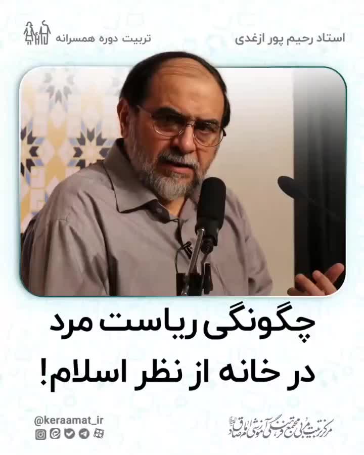 . 📍چگونگی ریاست مرد در خانه از نظر اسلام . گفته میشود در خانواده مسلمان، حرف آخر را باید مرد بزند. اما بگوید هرچه خانمم بگوید. در روایات ما واقعاً همن گفته میشود. می فرماید تا جایی که با اصول شریعت منافات نداشته باشد، خانواده از هم نپاشد باشد و اخلاق و عدالت در خطر نباشد، ریاست مرد در خانواده این است که بگوید حرف آخر را من میزنم، حرف مرد هم یکیست و آن این است که هرچه خانمم بگوید. در روایت داریم مرد مومن کسی است که وقتی در خانه میخواهد غذا بخورد، ببیند همسرش به چه چیزی اشتها دارد. کسی که چنین رفتار نکند منافق است. یعنی منافق، خانوادهاش را مجبور میکند که طبق علاقه او غذا بخورند. این بدان معناست که در هر جمعی و از جمله جمع دو نفره زن و شوهر، یک نفر باید مسئول و تصمیمگیر باشد. در خانواده مرد مسئول هست، به خصوص چون مسائل اقتصادی بر عهده اوست. اما این تصمیم گیری و اِعمال مدیریت باید در راه مصالح، عواطف و سلیقه همسر باشد نه ارضاء شهوات شخصی خود. . . . استاد رحیم پور. سخنرانی در جمع بانوان فرهنگی، سال ۸۸ . 🔻ما در کرامت، برایتان از اندیشه های مختلف تربیتی می گوییم، چراکه نگاه نقادانه ی شما ارزشمند است.🔻 . . . . . . . #رحیم_پور_ازغدی #خانه #همسرانه #عاشقانه #مرد #زن #همسر #عشق #ولایت #تربیت #مشاوره #کرامت