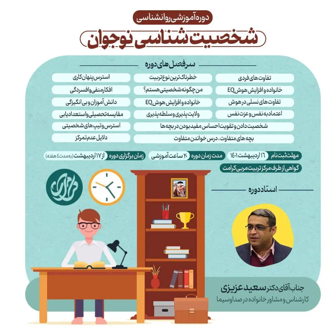 . 💡 *دوره مجازی شخصیت شناسی نوجوان* 🔸 ۲۰ ساعت آموزشی به مدت ۴هفته ⛔️ مهلت ثبت نام: ۱۶ اردیبهشت 📌 همراه با اعطای گواهی از طرف مرکز تربیت مربی کرامت ⭕️ این دوره به صورت آفلاین برگزار میشود. 🔆 *ارائه کد تخفیف به شرکت کنندگان دوره های گذشته کرامت، مادران دارای سه فرزند و بیشتر، طلاب و دانشجویان* ✔️ دریافت کد تخفیف و پشتیبانی با شماره 09021818022 در پیام رسان بله، ایتا و واتس آپ 🌐 اطلاعات بیشتر و ثبت نام در www.keraamat.ir ✅ @keraamat_ir #کرامت #آموزش #دوره_آموزشی #تربیت #دکتر_عزیزی #نوجوان