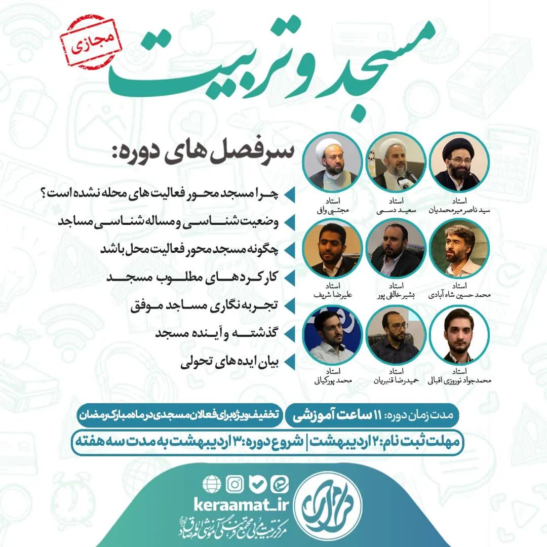 💡 دوره آموزش مجازی مسجد و تربیت 🔸 ۱۱ ساعت آموزشی طی ۳هفته ⛔️ مهلت ثبت نام: ۲ اردیبهشت 📌 همراه با اعطای گواهی از طرف مرکز تربیت مربی کرامت ⭕️ این دوره به صورت آفلاین برگزار میشود. 🔆 ارائه کد تخفیف به فعالان مسجدی، شرکت کنندگان دوره های گذشته کرامت، مادران دارای سه فرزند و بیشتر، طلاب و دانشجویان ✔️ دریافت کد تخفیف و پشتیبانی با شماره 09021818022 در بله، ایتا یا واتس آپ 🌐 اطلاعات بیشتر و ثبت نام در سایت کرامت . . . #مسجد #تربیت #آموزش #آموزش_تربیت #محله #معلم #نماز #دوره #طلبه #دانشجو #کرامت