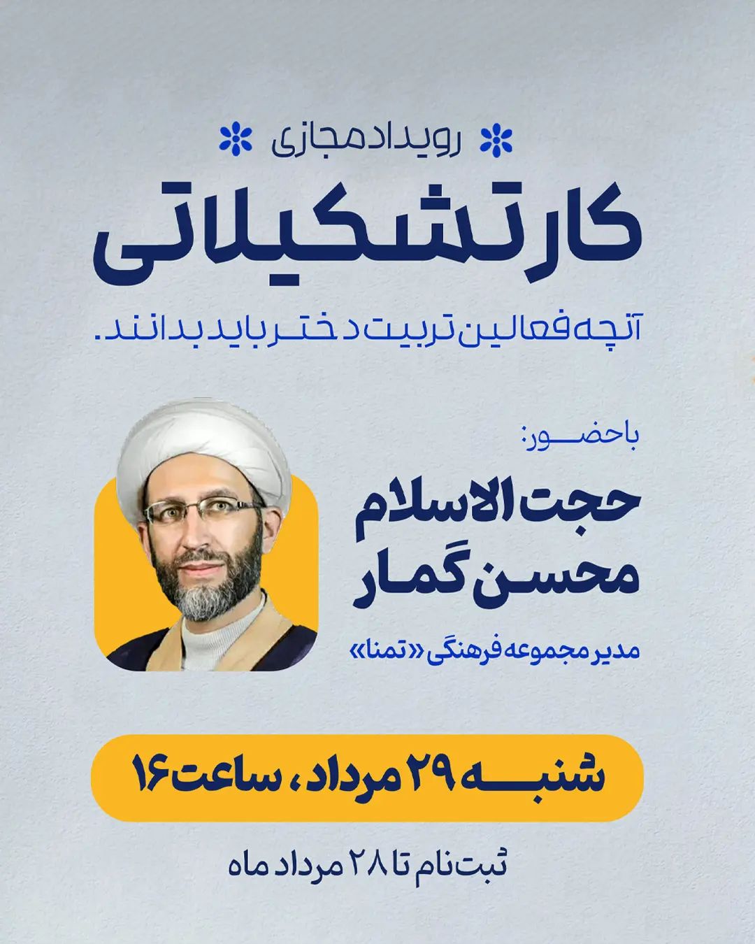 . 📣 رویداد مجازی "آنلاین" کار تشکیلاتی ⏰ زمان برگزاری: شنبه، ۲۹ مرداد ماه، ساعت ۱۶:۰۰ 🔴 مهلت ثبت نام: تا ۲۸ مردادماه 🔔 شرکت در این رویداد فقط به صورت "آنلاین" و در زمان برگزاری امکان پذیر است، صوت و فیلم جلسه در اختیار مخاطبین قرار نمی گیرد. 💻 جلسه در محیط اسکای روم برگزار می شود. 🌐 اطلاعات بیشتر و ثبت نام دوره در سایت کرامت 📲 پشتیبانی در یکی از پیام رسان های بله، ایتا یا واتساپ، با شماره 09021818022 یا @keraamat_majazi 🔻🔻🔻🔻🔻🔻🔻🔻🔻🔻🔻 ✅ @keraamat_ir #کرامت #تربیت #دوره_آموزشی #گمار #استاد_گمار #دختر #دختران #تربیت_دخترانه