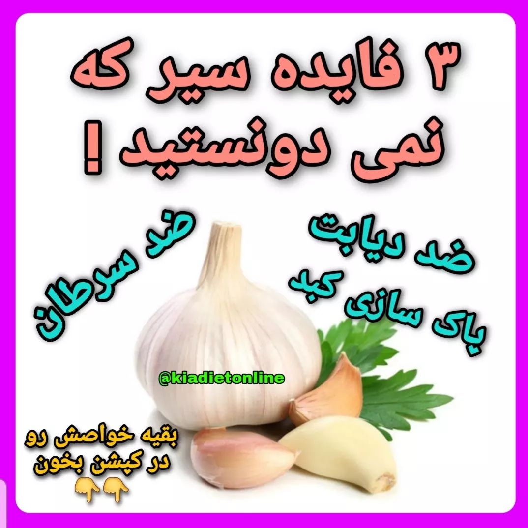 ❤🧡💚این یدونه خاصیت سیر رو نمی دونستی که برای چی ها خوبه ⁉️ مردم از دیرباز از سیر در آشپزی و پزشکی استفاده می کردند. هر حبه سیر حاوی تنها 4 کالری هست و یک عالمه خاصیت و فایده. ⭕⭕حتما هم خودتون بخورین و هم به بچه ها بدین. تازه اش خاصیت بیشتر داره بصورت ماست موسیر یا در خوراک ها استفاده کنید. ❌❌حاوی فیتو کمیکال ها و آلیسیوم ، یک آنتی بیوتیک طبیعی ، ضد سرطان ، ضد بیماری های قلبی ، ضد چربی خون ، پاک کننده کبد از آلودگی های فلزی ، ضد دیابت و کمک کننده به تنظیم و حساسیت انسولینی و... ❌❌فقط کسانی که التهاب و مشکل معده دارن ، زنان شیرده و کودکان زیر یکسال نباید بخورن. ⭕⭕شما سیر رو به چه صورت می خورین ⁉️ حتما این پست به دوستاتون هم بفرستین . ۱۵فروردین۱۴۰۱ @kiadietonline ➖➖➖➖➖➖➖➖➖➖➖➖➖➖ 📞 02188563201 📱 09021888035 تهران، شهرک غرب📍 ➖➖➖➖➖➖➖➖➖➖➖➖➖➖➖ 🎀خدمات ما : ارائه مشاوره حضوری وآنلاین برای اضافه وزن،لاغری ، بیماریها(قلبی، دیابت، کلیوی،کید چرب، فشارخون، کنسر، آلزایمر، یبوست، گیاهخواری و..) ، چاقی کودکان،رشدقدی، کم وزنی ، بد غذایی 🔻Foreign patients are admitted ➖➖➖➖➖➖➖➖➖➖➖➖➖➖➖ #افزایش_قد #چاقی_ #لاغری_کودک#افزایش_وزن #Nutritionist#مشاور_تغذیه_کودکان #لاغری#چاقی_کودک #کاهش_وزن #رژیم #سرطان #چربی_خون #تغذیه_کودک #دیابت #غذای_کودک#متخصص_تغذیه #چاقی_کودکان#سیر#drkia #قدکودکان #خواص_سیر