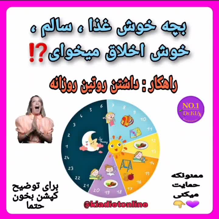 🔴🔴 برای فرزند تون برنامه و روتین روزانه دارین🔴🔴 کودکان با داشتن برنامه و روتین ، آرامش بیشتری دارن و بهتر میخوابن و بهتر غذا می خورن و در نتیجه سالم تر و خوش اخلاق ترن. 👏👏🤩🤩 هر روز حدود ساعت مشخصی ، از خواب بیدارشون کنید ، نهار حدودای ساعت ثابتی ، بازی و بیرون رفتن ، مسواک. و خواب و...همه ساعت های ثابتی از روز باشه. حتی می تونید ، جدول یا مثل شکل ما ساعت نقاشی کنید و روی اون با شکل مشخص کنید و در اتاق کوچولو تون بزنید تا خودش ببینه اجرا کنه. ⭕️⭕️ برای اجرای خوب برنامه توسط کودک هم امتیاز و استیکر و ... در نظر بگیرین. ❌️❌️دیگه چه روش هایی اجرا کردین ، به ما هم بگین، ممنون. ➖➖➖➖➖➖➖➖➖➖➖➖➖➖➖ 🎀خدمات ما : ارائه مشاوره حضوری وآنلاین برای اضافه وزن،لاغری ، بیماریها(قلبی، دیابت، کلیوی،کید چرب، فشارخون، کنسر، آلزایمر، یبوست، گیاهخواری و..) ، چاقی کودکان،رشدقدی، کم وزنی ، بد غذایی 🔻Foreign patients are admitted ➖➖➖➖➖➖➖➖➖➖➖➖➖➖➖ #افزایش_قد #چاقی#برنامه_غذایی #افزایش_وزن #دکتر_کیا#مشاور_تغذیه_کودکان #لاغری#چاقی_کودک #کاهش_وزن #رژیم #رشدکودک#غذای_کودک #چاقی_کودکان#لاغری #قدکودکان #روتین_کودک #برنامه_غذایی