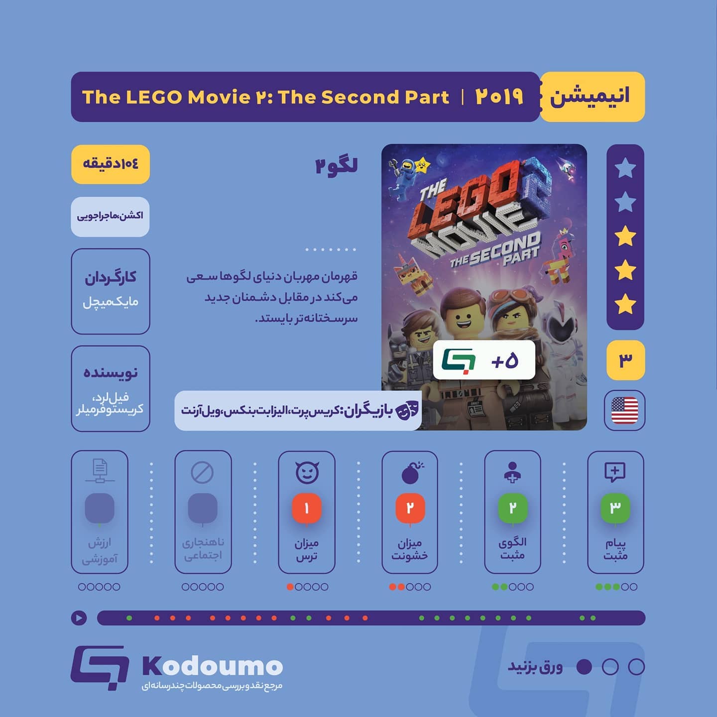 🎥 انیمیشن لگو۲ 📍در این قسمت لگوها با موجودات جدیدی که از فضا میآن، روبهرو میشوند و سعی میکنن سرسختانه در برابر اونها بایستن ؛ اما متوجه میشن که قصد اونها دوستیه و سرانجام لگوها و فضاییها با یکدیگر دوست میشن، این داستان اهمیت دوستی و روابط صمیمانه میان خواهر و برادر رو برای بچههای شما به نمایش میگذاره. 📍شخصیت اصلی فیلم، یعنی اِمِت اولش به علت کماهمیتبودن، دچار سرخوردگی میشه؛ اما کم کم، این حس، جای خودش رو به شجاعت و اعتمادبهنفس میده، والدین میتونن دربارهی وجود دنیای فانتزی رباتها و تفاوت اون با دنیای انسانها، با بچهها صحبت کنند. 📌 بیشتر بدانید : bit.ly/3mBhuBh 🔗 کدومو؛ همپای خانوادهها @Kodoumo #کدومو #انیمیشن #والدین #تربیت #لگو