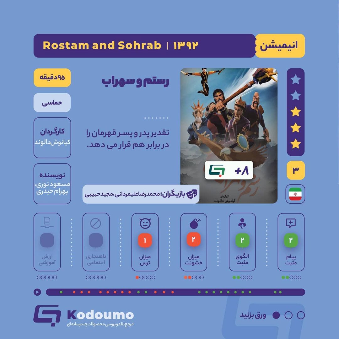 🎥 انیمیشن رستم و سهراب 📍رستم پس از ازدواج با تهمینه، برای دفاع از میهنش به ایران برمیگرده و فرزند تازه متولد شدهاش رو نمیبینه. سالها بعد، افراسیاب برای نابودی ایران و قهرمانش نقشهی شومی طراحی میکنه تا پدر به دست پسر جوونش کشته بشه. 📍نبرد و مبارزاتی در انیمیشن به تصویر کشیده شده که در بسیاری از اونها سربازان و فرماندهان کشته یا زخمی میشن. این انیمیشن عاری از هرگونه ناهنجاری اجتماعیه. رستم شخصیتی قهرمان و در حد یک الگوی مثبت در این انیمیشن به تصویر کشیده شده. پیام اصلی انیمیشن، «رستم و سهراب» دفاع از میهن و ستایش فرهنگ پهلوانیه. این انیمیشن فرصت مناسبی برای آشنایی بیشتر کودکان و نوجوانان با فرهنگ و هویت ایرانی میتونه باشه. 📌 بیشتر بدانید: yun.ir/b3l6ca 🔗 کدومو؛ همپای خانوادهها @Kodoumo #کدومو #فیلم #والدین #تربیت #رستم_و_سهراب