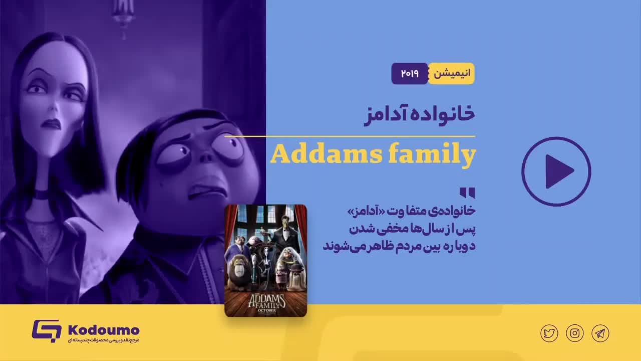 📍«خانوادهی آدامز» یه انیمیشن در ژانر کمدی و ترسناکه و داستان خانوادهی متفاوتی بهنام آدامز رو برامون روایت میکنه این خانواده به دلیل تفاوتهاشون، بین مردم بهعنوان هیولا شناخته شدن و با شورش مردم مجبور میشن دور از انسانها زندگی کنن. سبک زندگی خانوادهی آدامز با خشونت بالا؛ اما فانتزی همراهه. 📌به کدومو بیاید و ارزیابی خودتون رو بنویسین: lish.ir/1GSu 🔗 کدومو؛ همپای خانوادهها @Kodoumo #اموزش #بررسی #کدومو #خانواده #والدین #انیمیشن