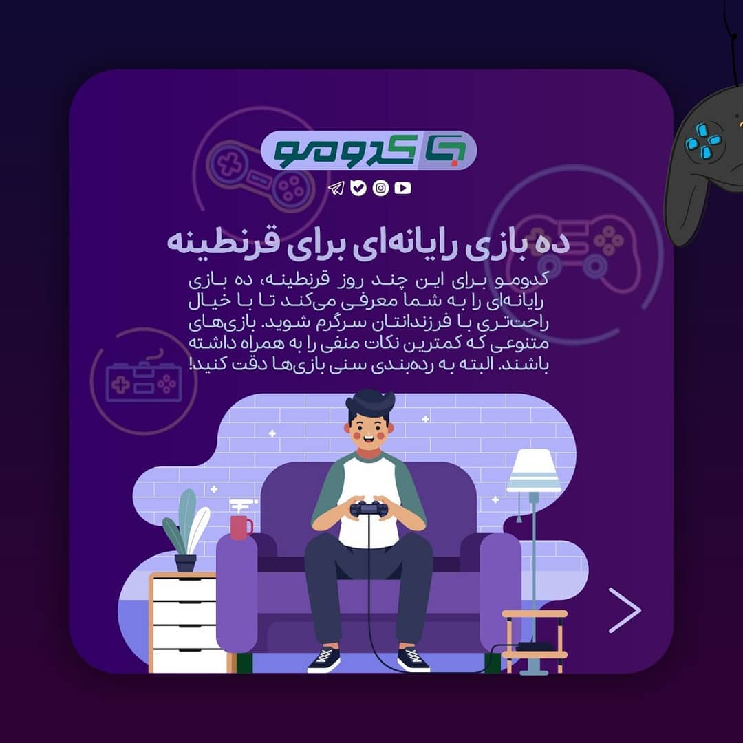 📍ده بازی رایانهای برای روزهای قرنطینه! 🔻بازیهای دیجیتال، میتونه تحمل قرنطینه رو راحتتر کنه و به بهتر و صمیمانهتر کردن رابطه پدر و مادرها با فرزندشون کمک کنه. اما در بین بازیهایی که هر روز منتشر میشن، کدومشون بدون اینکه به فرزندمون آسیب بزنه، لحظات خوبی رو برای خانواده ما به ارمغان میاره؟ امروز که همهی بازیها، آنلاین شدند، آیا هستند هنوز بازیهایی که مثل قدیم، ما رو دور هم جمع کنه؟ کدومو برای این چند روز قرنطینه و برای اوقات فراغت خانوادهها، بازیهایی رو انتخاب کرده و به شما معرفی میکنه تا با خیال راحتتری با فرزندانتون سرگرم بشید. بازیهای متنوعی که حداقل نکات منفی را به همراه داشته باشن. به ردهبندی سنی بازیها دقت کنین! سری اول، ده بازی رایانهای هستن که در تصاویر مشاهده میکنین ❤ کدومو؛ همپای خانوادهها 🔗 @Kodoumo #کدومو #بازی #قرنطینه #بازی_آنلاین