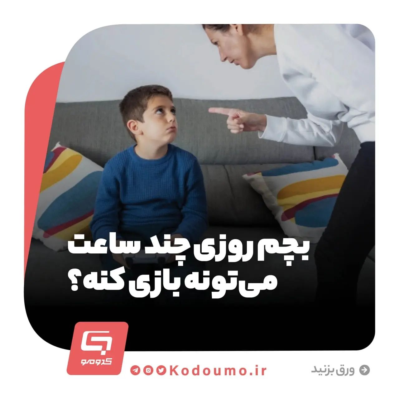 سلام مامان باباهای مهربون 📍حتما برای شما هم این سوال پیش اومده که فرزندتون روزی چند ساعت میتونه بازی کنه!؟ 📍امروز در مورد «اسکرین تایم» یا خودمونی تر بگیم میزان استفاده روزانه فرزندتون از تلویزیون، تبلت، گوشی و کنسول بازی صحبت کردیم و به شما توضیح دادیم که اگه فرزندتون بیشتر از این زمان داره بازی کنه چیکار کنید. این میزان ساعتهایی که آوردیم بر اساس استانداردهای بینالمللی و مقالات روز دنیا تعیین شده. 📍برامون بنویسید که فرزند شما چند سال داره و معمولا چند ساعت در روز رو پای گوشی، تبلت، بازی و تلویزیون میشینه! شما چه راهحل هایی برای مدیریت زمان بازی کردن بچهها پیشنهاد میدید! #تلویزیون #کنسول_بازی #تبلت #بازی #سواد_رسانه #حساس_باشیم #کدومو #خانواده 🔗 کدومو؛ همپای خانوادهها 🔗 @kodoumo