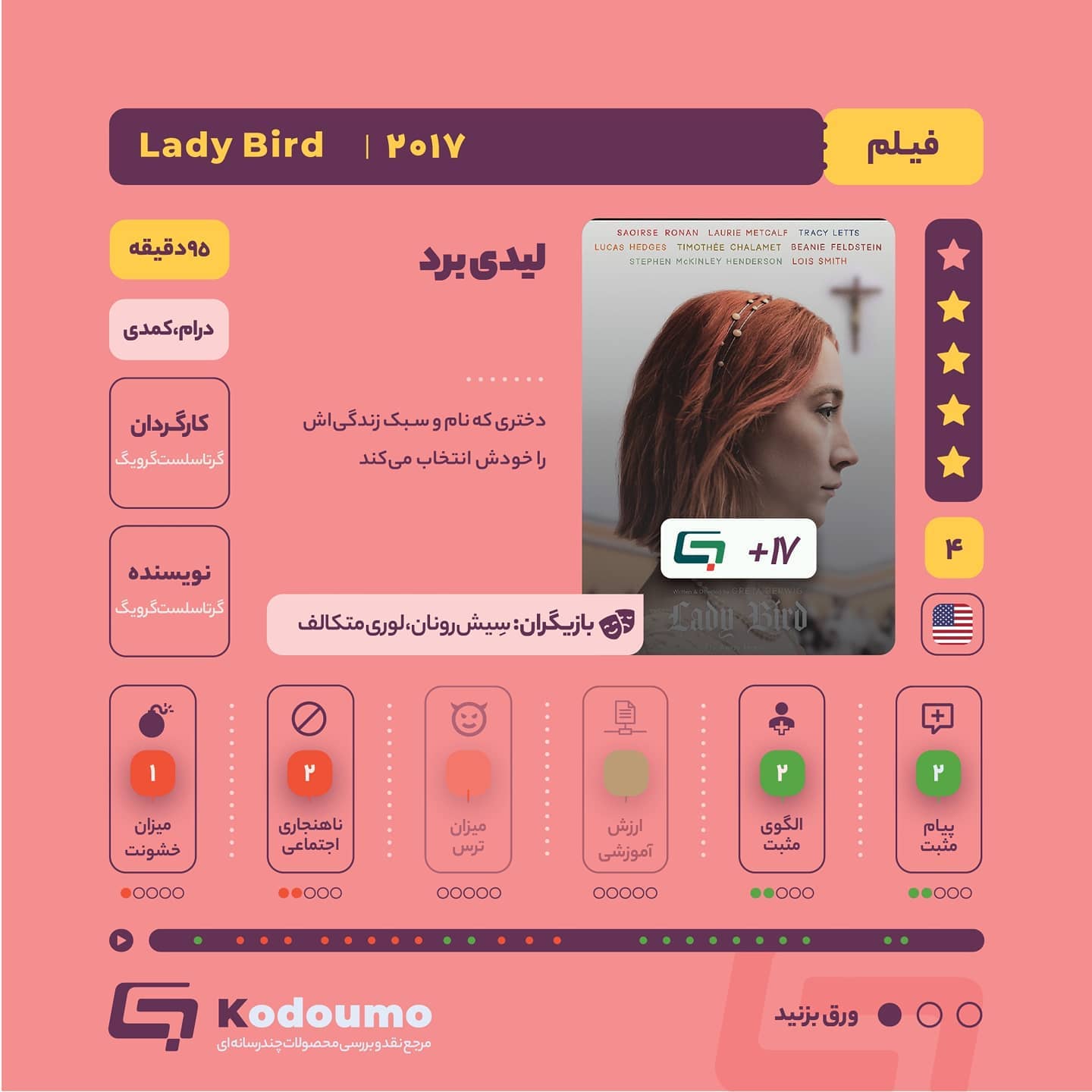 🎥 فیلم لیدی برد 📍 لیدی برد دختر نوجوانیه که ساکن محله ساکرامنتو کالیفرنیاست و در سال آخر دبیرستان تحصیل میکنه. اون تلاش میکنه تا وضع زندگیاش رو تغییر بده و برای تحصیل در دانشگاه به نیویورک بره. 📍 لیدی برد دختری که دوست داره در خونه و موقعیت بهتری زندگی کنه. اون به مشکلات خانواده ازجمله بیکاری پدرش، توجهی نداره. لیدی برد در دوران مدرسه به پسری علاقهمند میشه. این فیلم تحولات و هیجانات فرزندان در دورهی بلوغ و نوجوانی (ازجمله تمایل به پیشرفت و ترقی و رابطهی بین دختر و پسر) رو نمایش میده. دربارهی تصمیمات لیدی برد و اتفاقاتی که برای اون میافته، با بچهها حرف بزنین. 📌به کدومو بیاید و ارزیابی خودتون رو بنویسین: yun.ir/4ukuo1 🔗 کدومو؛ همپای خانوادهها @Kodoumo #کدومو #فیلم #والدین #تربیت #لیدی_برد