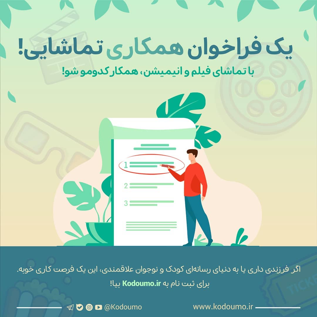 💥 یک فراخوان همکاری تماشایی! 🎬 با تماشای فیلم و انیمیشن، همکار کدومو شو! کودکها و نوجوانها عاشق انیمیشن و فیلماند و هر هفته وقت زیادی را با این آثار میگذرانند؛ اما میدانیم که این محصولات، تأثیرات مختلفی دارند، چه مثبت و چه منفی. در کدومو ما به پشتوانهی پژوهشها، اساتید و نظرات کاربران، این آثار را ارزیابی میکنیم تا خانوادهها دربارهاش بیشتر بدانند. مثلا ارزیابی انیمیشن پرسروصدای روح را در صفحه اول کدومو بخوانید. و حالا کدومو به همکاران بیشتری نیاز دارد تا آثار رسانهای بیشتری را ارزیابی کند. این یک فراخوان است! اگر شما هم فرزندی داری، مربی هستی یا به دنیای کودک و نوجوان علاقمند هستی، همکار کدومو شو! فقط کافی است فرم ثبتنام را تکمیل کنی. کدومو با شما تماس میگیرد. برای ارسال توانمندیها و ثبتنام برای همکاری با کدومو، روی لینک بیوی صفحه کلیک کنید! kodoumo.ir/فراخوان-همکاری کدومو؛ همپای خانوادهها @Kodoumo