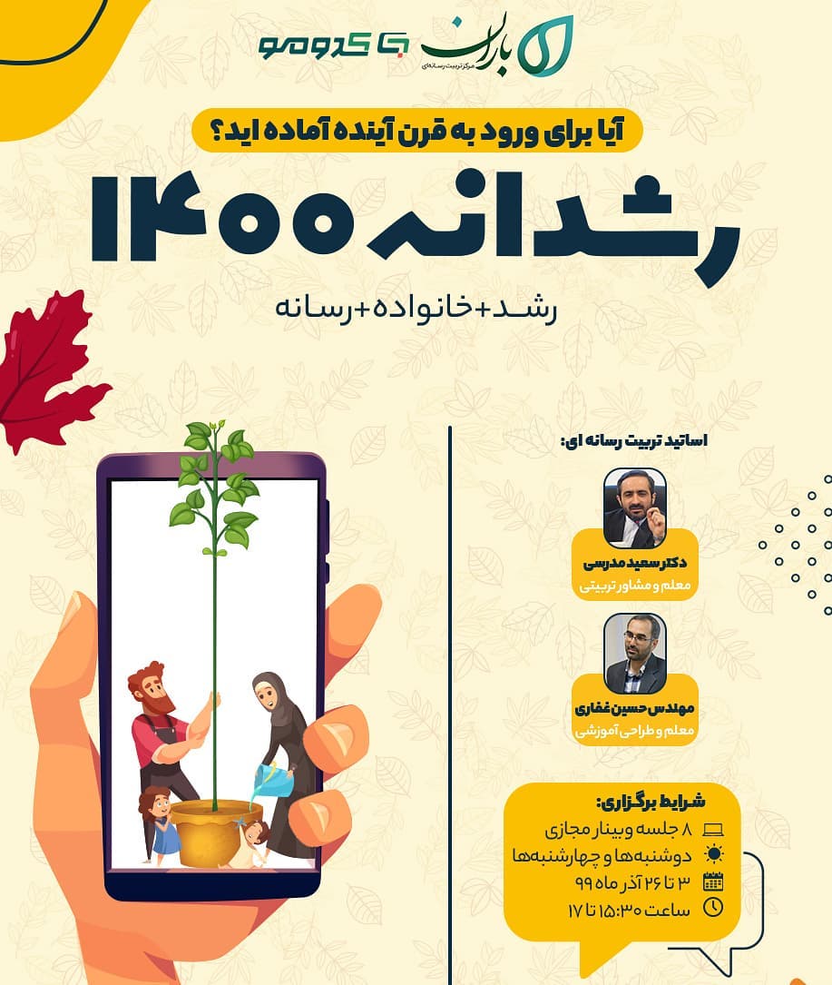 🚸 آیا برای ورود به قرن جدید آمادهاید؟ 📍 کدومو و مرکز تربیت رسانه ای باران برگزار می کنند: 🔷 سومین دوره رشدانه ۱۴۰۰ [آذر ۹۹] 🔰 فرزندپروری در عصر دیجیتال 💡 چگونه در آموزش مجازی فرزندانمان را هدایت کنیم؟ 💡 چگونه از هویت فرزندانمان در فضای مجازی محافظت کنیم؟ 💡 چه کنیم تا کودکانمان از بازیهای دیجیتال استفاده مفید داشته باشند؟ 💡 چگونه درباره محتوای رسانهها با فرزند نوجوانمان گفتگو کنیم؟ 💡 چگونه مراقب حریم خصوصی فرزندانمان در فضای مجازی باشیم؟ و پاسخ به ده ها سوال دیگر در زمینهی تربیت رسانهای فرزندان ... 💻 غیر حضوری ( مجازی) 🥇 ویژه والدین_هوشمند 📍 زمان برگزاری دوره: 🗂 ۸جلسه ۱۲ساعت آموزشی 🗓 ۳ آذر لغایت ۲۴ آذر ۹۹ 🔻مهلت ثبتنام تا ۲ آذر دوشنبه ها و چهارشنبه ها ⏱ ۱۵:۳۰ تا ۱۷ 📌 کد تخفیف پنجاههزار تومانی ویژهی مخاطبان کدومو: BMTC-KODUMO-9909 🌐 کسب اطلاعات بیشتر و ثبت نام : https://bmtc.ir/?p=1214 📱@bmtc_ir @kodoumo