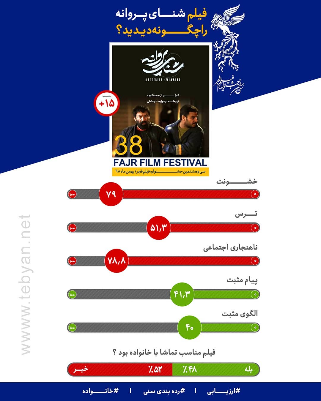 نظرسنجی مردمی کدومو از فیلم "شنای پروانه " 📊خشونت : ۷۹ 📊ترس: ۵۱.۳ 📊ناهنجاریهای اجتماعی : ۷۸.۸ 📊پیام مثبت : ۴۱.۳ 📊الگوی مثبت : ۴۰ ۴۸ درصد تماشاگران این فیلم را مناسب تماشا با خانواده دانسته اند. به نظر شما این فیلم مناسب تماشا با خانواده است ❓ #کدومو #جشنواره_فیلم_فجر #فیلم_فجر #فجر