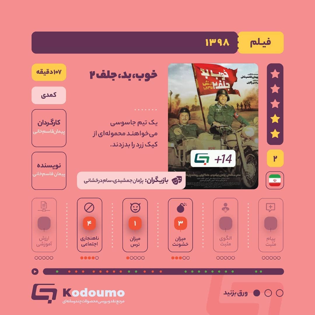 📍خوب بد جلف ۲ 🔻یک تیم جاسوسی با عنوان گروه فیلمسازی وارد ایران میشوند و در تلاش هستند تا محمولهای از کیک زرد را بدزدند. این فیلم دارای صحنههای متعددی از نگاه جنسی به زنان، شوخی و مکالمات جنسی و همچنین تمسخر، دروغگویی و تحقیر است. در طول تماشای این محصول، ممکن است فرزند نوجوان شما متوجه بعضی از رفتارها و مکالمات نشود. این رفتارها و مکالمات اشارههای کاملاً جنسی داشته که در تعداد زیادی از سکانسها بهصورت واضح دیده میشود. ممکن است با درک این مکالمات فرزند شما دچار سؤالات و ابهاماتی شود و در بعضی موارد این مکالمات را بهصورت کاملاً فانتزی برای خود تصور کند. شما این فیلم رو با فرزندتون دیدید؟ نظرتون چیه؟ 📌 کدومو؛ همپای خانوادهها @Kodoumo #خوب_بد_جلف۲ #خوب_بد_جلف #خوب_بد_جلف_۲ #کدومو #فیلم #روانشناسی
