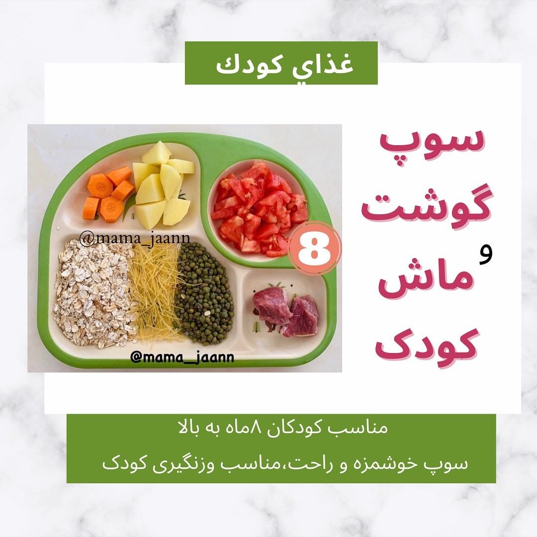 سلام به مادراي مهربون اميدوارم كه حال دلتون خوب باشه🥰😘 این هم ی سوپ خوشمزه و مقوی و آسون😎😎😇 سوپ گوشت و ماش(+۸)🥘 گوشت گوسفند:۲۰گرم🥩 ماش:۱قاشق غذاخوری گوجه پوست کنده خردشده:۱عدد🍅 ورمیشل یا ماکارونی جوپرک:۱قاشق غذاخوری سیب زمینی:نصف عدد کوچک🥔 هویج:نصف عددکوچک🥕 گوشت،ماش،گوجه،سیب زمینی و هویج و جو رو با ی لیوان آب گذاشتم خوب بپزه وقتی که پخت ورمیشل روبهش اضافه کردم و گذاشتم خوب جا بیافته.سوپ راحت و مقوی که واسه رشد و وزنگیری بچه ها عالیه👍🏻 نکته: میتونید بهش عصاره قلم،کره،جعفری اضافه کنید. اگراز اکسپلور یا هشتک پست ماماجان رومیبینی به پیج مون سر بزن جواب کلی از سوالات اینجاست🥰🥰😍 @mama_jaann @mama_jaann #غذای_کودک #غذای_کمکی #سوپ_کودک #سوپ_گوشت #غذای_کودک_ماماجان #وزنگیری_کودک #رشد_کودک #سوپ_خوشمزه #راهنمای_تغذیه_سالم_کودکان #غذای_فوری #غذاي_كودك_ماماجان