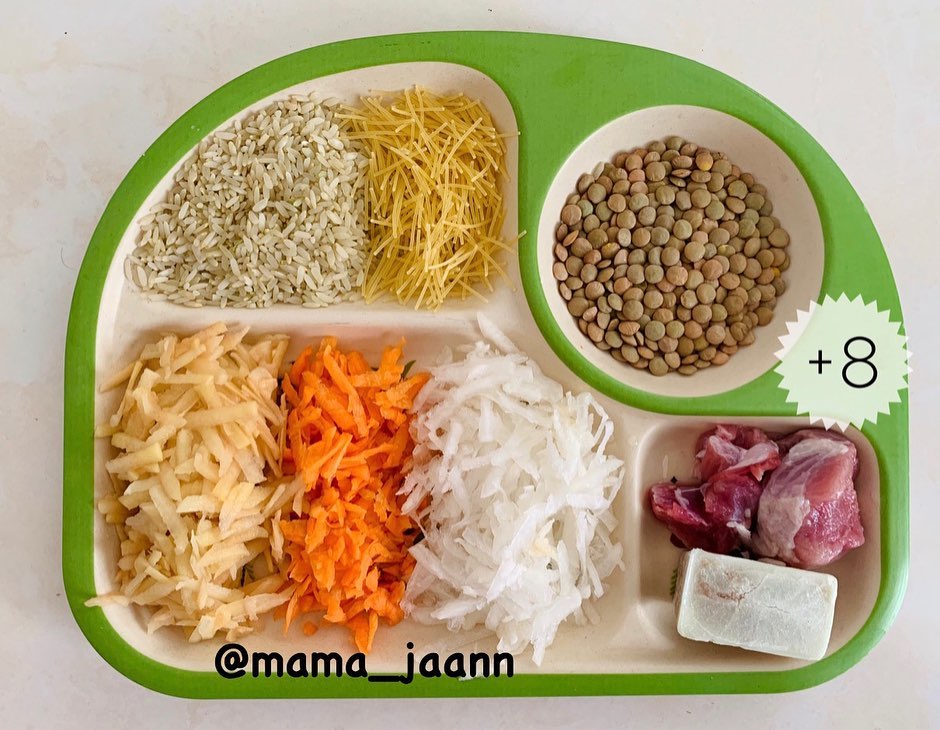 سلام ماماناي گل امروز اومدم با ي سوپ به طعم پاييز و عاليه واسه وزنگيري👌🏻 خوشگلا چرا لايك نميكنيد انرژي ندارم ديگه پست بزارم🥺 حتما سيوش كن كه بعدا هم خواستي زود پيداش كني🤓و سريع بفرست به يه دوست كه اونم درست كنه😍🥰 سوپ گوشت و شلغم(+٨) هويج:نصف يك عدد سيب زميني:ي دونه كوچولو شلغم:٢عدد كوچك عدس:١/٥قاشق غذا خوري برنج:١قاشق غذا خوري ورميشل:به اندازه دلخواه عصاره قلم:١قالب گوشت:٢تكه خورشتي اول سيب زميني،هويج،شلغم،عدس ،گوشت وعصاره با ي ليوان آب ريختم داخل زودپز و گذاشتم تا خوب بپزه و قتي كه پخت برنج خيس كرده رو با ورميشل بهش اضافه كردم و گذاشتم تا جا بيفته.سوپ شما اماده ست👌🏻نوش جان😘❤️ نكته:👇🏻 ١-ميتونيد به سوپتون دال عدس يا ماش هم اضافه كنيد. ٢-از سبزيجاتي مثل جعفري،گشنيز و شويد هم ميشه استفاده كرد. ٣-لطفا غذاهايي كه گوشت دارن رو به خوبي بپزيد طوري كه وقتي چنگال ميكشيد له بشه. ٤-از ١٠ماهگي ميتونيد كمي زردچوبه هم به سوپ كودك بزنيد. ٤-اگه ميخوايد كالري غذا بيشتر بشه و وزنگيري بهتري داشته باشه ميتونيد كره بهش اضافه كنيد. #سوپ_كودك #سوپ_گوشت #شلغم #غذاي_كودك #غذاي_كمكي #سوپ_كودك_سوپ_مقوي @mama_jaann