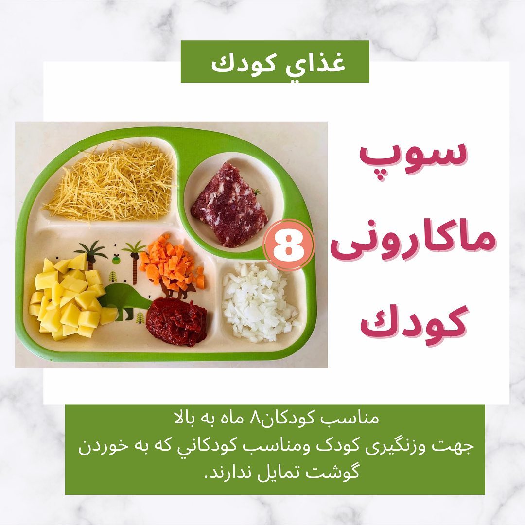 سلام شب سرد زمستونی تون به خیر وخوشی😍😍 این هم ی سوپ فورتی فوتی واسه کوچولوهای نازنین⛄️😘🥳 *سوپ ماکارونی *(+۸)🍜 ورمیشل یا ماکارونی: سیب زمینی:نصف یک عددکوچک🥔 هویج:نصف کوچک🥕 پیاز:۱عدد کوچک🧅 رب خونگی یا پوره گوجه:یک قاشق چای خوری رب یا یک عددگوجه🍅 گوشت چرخ کرده:۲۰گرم🥩 ✅ابتدا کمی پیاز رو با روغن کنجد تفت دادم بعدش سیب زمینی رو ریختم و اونم ی کم تفت دادم سپس گوشت چرخ کرده رو بامواد تفت دادم ورب و هویج رو اضافه کردم دوتا استکان اب ریختم تا مواد خوب بپزه نیم ساعت اخر هم ورمیشل رو ریختم و گذاشتم بپزه. 💛شما نسبت به ذائقه کوچولوتون میتونین آب دار یا کم آب بردارین. 💜نکته: 1️⃣ورمیشل همون رشته سوپ هست اگه نداشتید میتونید ماکارونی رو ریز کنید و بریزید. 2️⃣میتونید جعفری هم بریزید. 3️⃣به جای گوشت چرخ کرده می تونید از مرغ استفاده کنید. نوش جان کودک شما😍 غذا هاتون رو برامون بفرستید تا واسه نی نی ها طبخ کنیم و لذت ببرن🌹🌹 💖✅کلی غذا خوشمزه ونکته آموزشی داخل پیج هست حتما ی سر بهش بزن😍😍 @mama_jaann @mama_jaann @mama_jaann #غذاي_كودك#تغذیه_کودک #غذای_سالم #سوپ #مادر #نوزاددختر #نوزادپسر #غذاي_خانگي #خوشمزها#رشد_کودک #ورميشل #غذاهای_خوشمزه#وزنگیری_کودک #غذای_نوزاد_زیر_ده_ماه