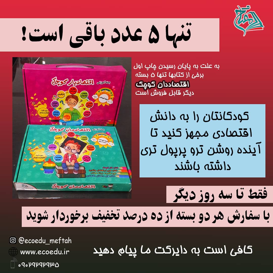 😊 فقط تا سه روز دیگر! . مفاهیم بسته اقتصادیارکوچک۱:(قیمت ۷۰ هزارتومان) . "انتخاب و تصمیم گیری" ، "صرفه جویی و قناعت" ،"کار" ، "همکاری" ، "شغل و درامد "، "پس انداز و سرمایه گذاری" ،"تولید"، "عدالت"، "بخشش "و در نهایت "تدبیر خرج" در قالب داستانهای مختلف . مفاهیم بسته اقتصاددان کوچک:(۶۰هزارتومان) "مبادله "تولید"، "بازار"، "خرید" ،"فروش"،"عوامل تولید" ،"خرید آگاهانه"،نیاز وخواسته"،"رفتار صحیح در فروشگاه"،"پس انداز"،"تصمیم گیری"،"انتخاب" ،"کمیابی" در قالب داستان های مختلف . ✔این دو بسته در کنار هم یک مجموعه فوق العاده کامل از مفاهیم اقتصادی را پوشش می دهند😍😍😍 . قیمت کل: 🔸۱۳۰ هزارتومان🔸 قیمت با تخفیف تا تاریخ ۲۴ اردبهشت ۹۹:🔸 ۱۱۷ هزارتومان🔸 . ❣اگر والدین یا مربی هستید ،جهت هماهنگی و اعمال تخفیف به دایرکت پیام دهید❣ . ◀مفتاح؛موسسه فرهنگی هنری تربیت اقتصاد حکیم @ecoedu_meftah @ecoedu_meftah @ecoedu_meftah