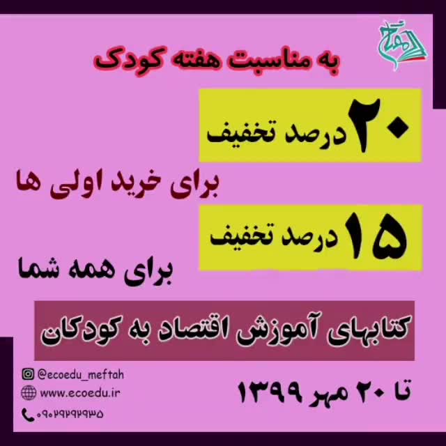 🌺مژده مژده🌺 . به مناسبت هفته کودک تا یکشنبه هفته آینده ۲۰ مهرماه میتوانید همه محصولات مفتاح( کتاب داستان های اموزش سواد مالی و اقتصادی به کودکان) را با تخفیف بخرید 😍😍😍😍😍 . خرید اولی ها ۲۰ درصد تخفیف دارن و سایرین هم ۱۵ درصد😊😊. . دراین فیلم تمامی کتاب داستانهای موسسه مفتاح به همراه موضوع و 👈قیمت اصلی👉 به تفکیک گروه سنی اورده شده. شما میتونید یا کتاب داستان تکی سفارش بدید یا به صورت بسته های "اقتصاددان کوچک" و "اقتصادیار کوچک" . در هر یک از این بسته ها ۷ کتاب داستان قرار میگیره به همراه یک کتاب کار برای تمرین بچه ها و یک راهنمای والدین🙂 . قیمت اصلی: بسته اقتصاددان کوچک(۶-۹ سال): ۱۱۲۴۰۰ تومان بسته اقتصادیار کوچک ۱(۶-۹ سال): ۱۰۵۰۰۰تومان .کتابهای ۹تا۱۲ را فقط به صورت تکی بخرید😃 . برای مشاوره و خرید و اعمال تخفیف فقط به دایرکت مراجعه کنید 🤚🤚 . توضیحات بیشتر کتابها را میتونید در سایت یا در پست های اینستاگرام ببینید.😊 .www.meftahpub.ir 🔘مفتاح؛ موسسه فرهنگی هنری تربیت اقتصاد حکیم @ecoedu_meftah
