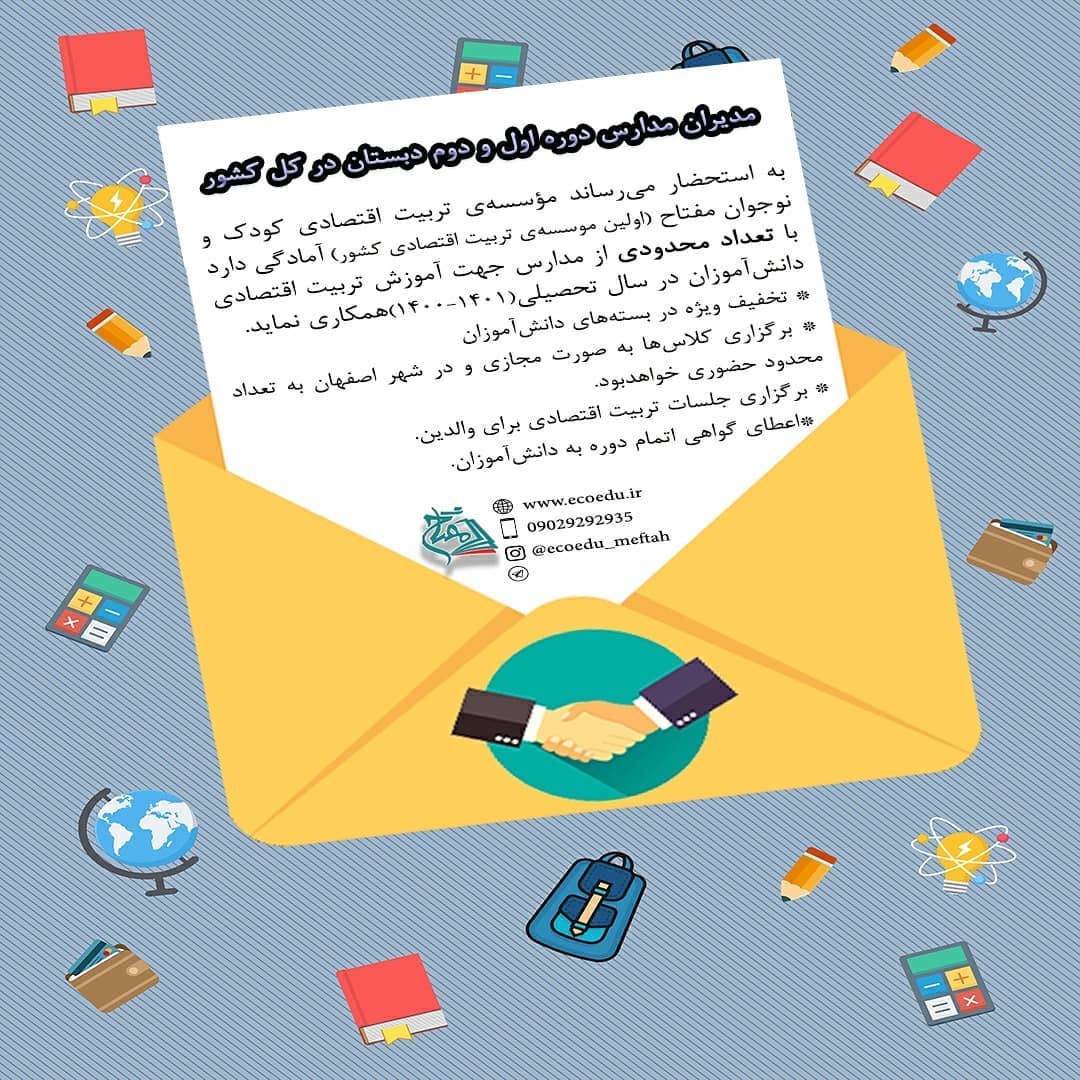 ✔قابل توجه مدیران محترم مدارس در کل کشور . موسسه تربیت اقتصادی مفتاح با سابقه ۵ سال تدریس سواد اقتصادی کودک و نوجوان طبق استاندارهای بین المللی، دینی و ملی در مدارس سطح کشور، آماده ارائه خدمت به تعداد محدودی از مدارس در سال تحصیلی ۱۴۰۰-۱۴۰۱ در زمینه های زیر است: . ۱-برگزاری دوره های تربیت اقتصادی برای پایه اول تا ششم ۲-ارائه گواهی پایان دوره برای تمامی دانش اموزان ۳-ارائه بسته های آموزشی مناسب هر گروه سنی با تخفیف ویژه مدارس ۴- برگزاری جلسات تربیت اقتصادی ویژه والدین . 👈👈جهت اطلاعات بیشتر و اقدام برای امضای طرح تفاهم نامه با موسسه فرهنگی مفتاح می توانید روزانه از ساعت ۹ الی ۳ بعد از ظهر با شماره تلفن درج شده روی پوستر تماس حاصل فرمایید. . 09029292935 🏴با برگزاری دوره تربیت اقتصادی در مدرسه تان؛ مدرسه خود را متمایز کنید🏴 . #اقتصاد_را_از_کودکی_فرهنگ_سازی_کنیم🌸 . ◀مفتاح؛موسسه فرهنگی هنری تربیت اقتصاد حکیم @ecoedu_meftah