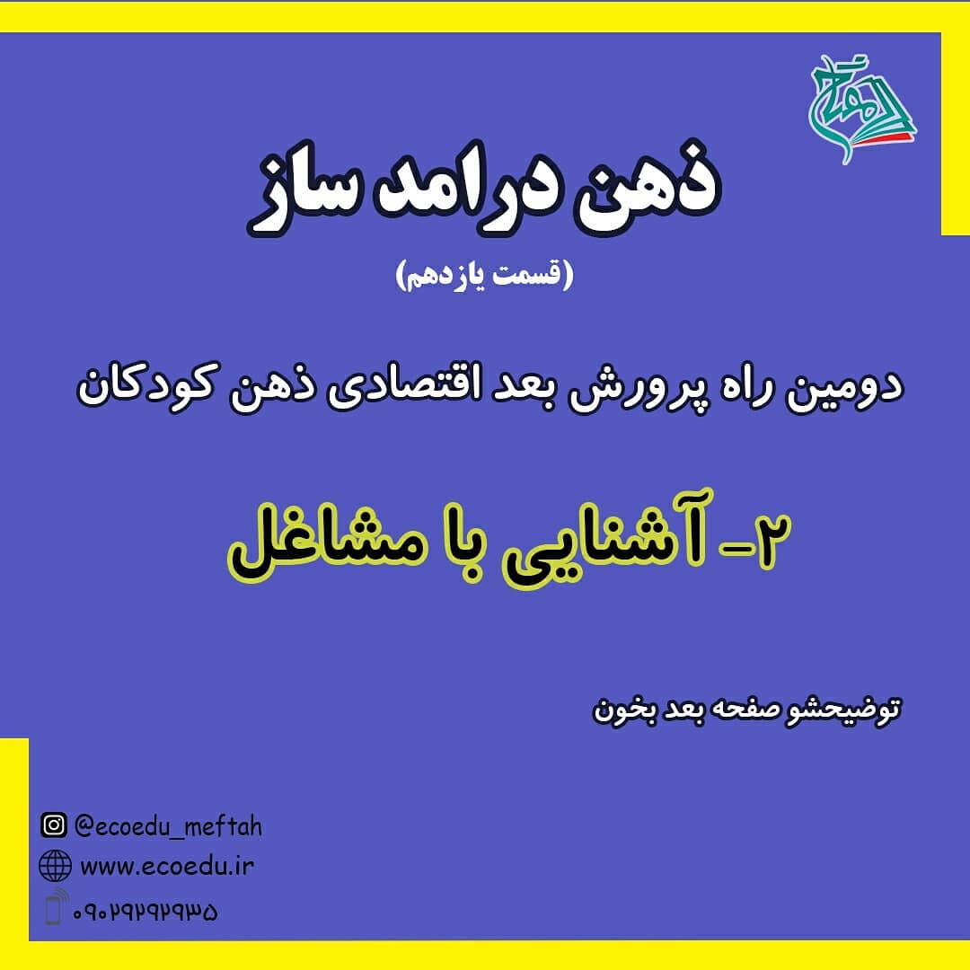 🌹 گفتیم که اولین راه پرورش بعد اقتصادی ذهن کودکان ایجاد نمایشگاه تولیدات خانگیه👌 . به عنوان دومین راه آشنایی با مشاغل مختلف رو بهتون پیشنهاد می کنیم🌹 . حتما همه صفحاتو بخونید✌ . #اقتصاد_را_از_کودکی_فرهنگ_سازی_کنیم🌸 ◀مفتاح؛موسسه فرهنگی هنری تربیت اقتصاد حکیم @ecoedu_meftah #شغل#کودک#شاغل#تربیت_اقتصادی_کودکان #موسسه_فرهنگی_تربیت_اقتصاد_حکیم #مفتاح_حکیم #مفتاح