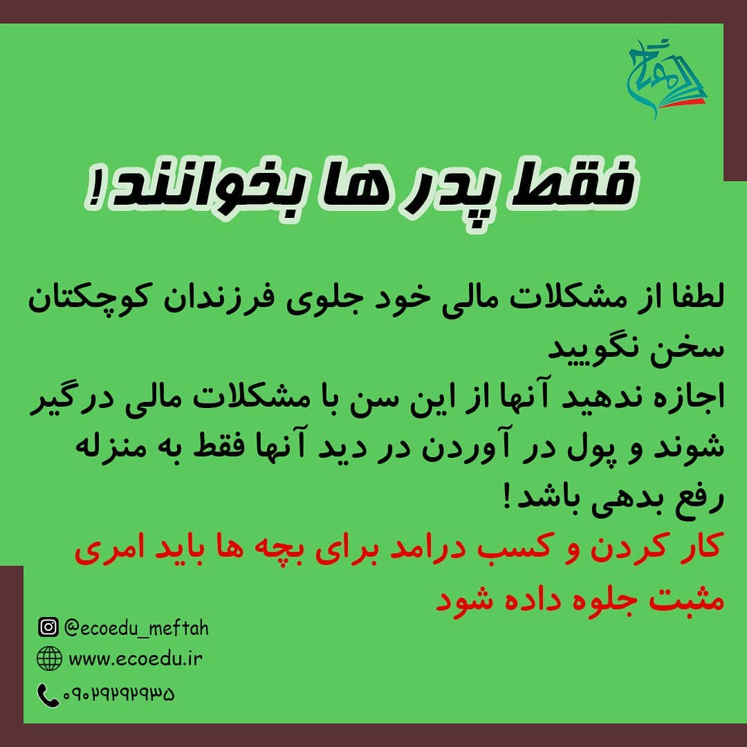 این متن واقعی را تا اخر بخوانید👇 . داشتم با یکی از کودکان اقوامم که خانواده شان را هم خوب میشناختم صحبت می کردم که تعجب کردم: . گفتم میتونی اون مدادو به مامان یا بابا بگی برات بخرن گفت نه بابام پول نداره گفتم چرا میتونه برات مداد بخره گفت نه همیشه وقتی میاد خونه میگه من پول ندارم ولی بابا بزرگم یه عالمه پول داره.... . (بابا بزرگش شاید درامدش کمتر از باباش بود ولی هیچ وقت جلوی بچه ها و نوه هاش نگفته بود پول ندارم...) . ✔حواسمان به حرف هایمان باشد✔ . ◀مفتاح؛موسسه فرهنگی هنری تربیت اقتصاد حکیم @ecoedu_meftah @ecoedu_meftah
