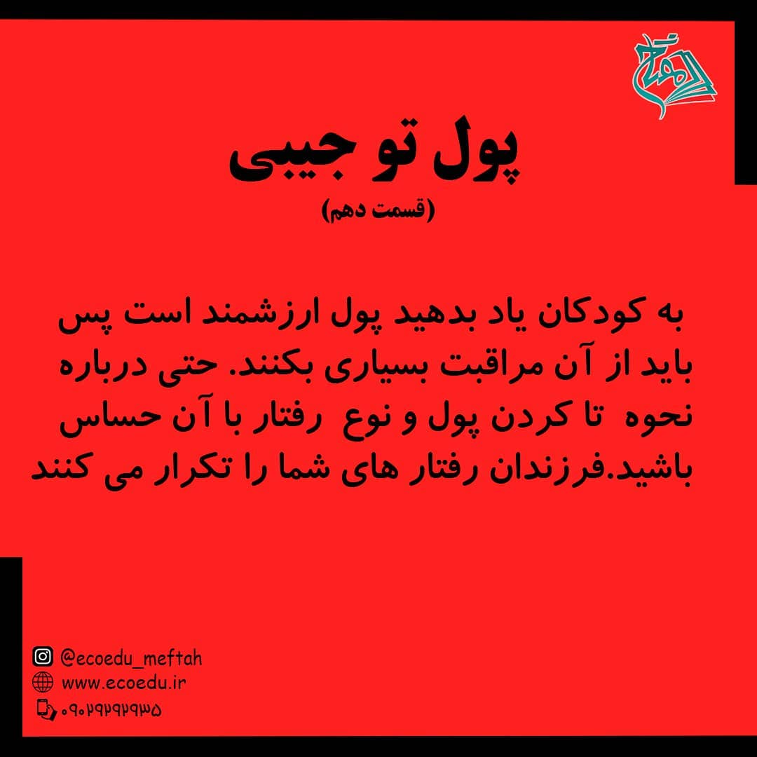 💸 پول تو جیبی "قسمت دهم" . مراقبت از پول به معنای پول پرستی نیست.بلکه به این معنا است که پول ارزشمند است و برای به دست اوردن آن تلاش شده. . ◀مفتاح؛موسسه فرهنگی هنری تربیت اقتصاد حکیم @ecoedu_meftah #پول#پول_توجیبی #پول_تو_جیبی #پولی#مال#مالی#اقتصاد_خانواده #اقتصاد_کودک #اقتصاد_نوجوان #موسسه_فرهنگی_تربیت_اقتصاد_حکیم #مفتاح