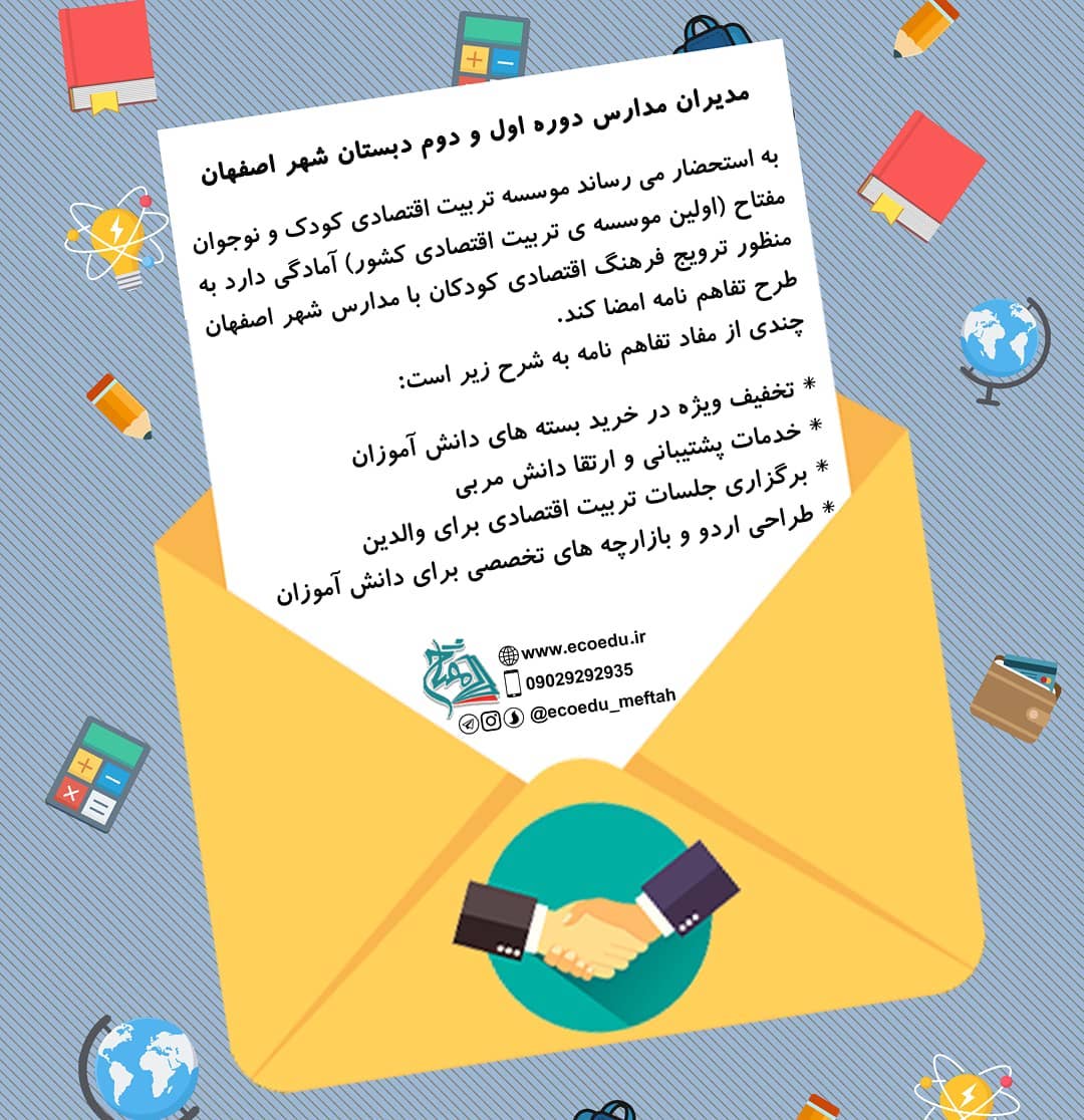 🌹 ✔قابل توجه مدیران محترم مدارس شهر اصفهان . 👈👈جهت اقدام برای امضای طرح تفاهم نامه با موسسه فرهنگی مفتاح می توانید روزانه از ساعت ۹ الی ۳ بعد از ظهر با شماره تلفن درج شده روی پوستر تماس حاصل فرمایید. . 🏴با برگزاری دوره تربیت اقتصادی در مدرسه تان؛مدرسه خود را متمایز کنید و با امضای طرح تفاهم نامه؛ این دوره را ارتقاء ببخشید🏴 . #اقتصاد_را_از_کودکی_فرهنگ_سازی_کنیم🌸 . ◀مفتاح؛موسسه فرهنگی هنری تربیت اقتصاد حکیم @ecoedu_meftah @ecoedu_meftah