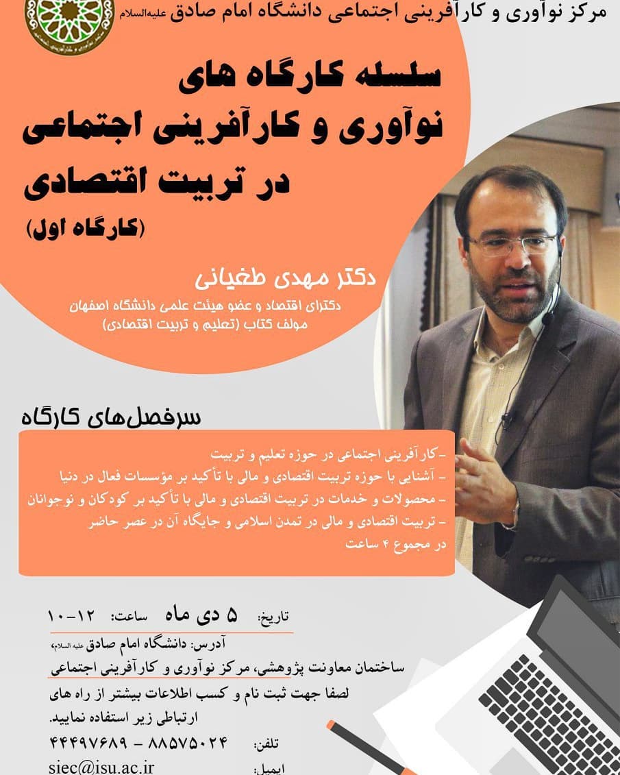توجه😃👈 "سلسه کارگاه های نو اوری و کارافرینی اجتماعی در تربیت اقتصادی" توسط دکتر مهدی طغیانی✔✔✔ واقع در: دانشگاه امام صادق ؛تهران🔻🔺✅ #کار_افرینی#دانشگاه#معاونت_پژوهشی#اقتصاد#همایش#تربیت_مالی#تربیت_اقتصادی#کودک#نوجوان#دکتر_مهدی_طغیانی