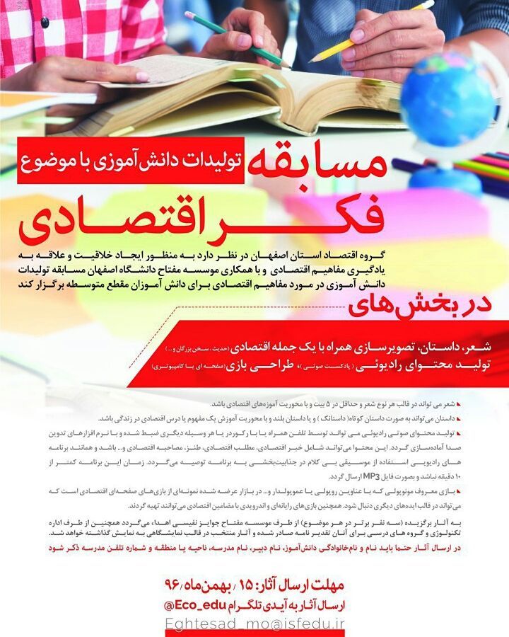 📣📣توجه توجه😍 مسابقه ی تولیدات دانش اموزی با فکر اقتصادی👍👍🔔 مخصوص دانش آموزان مقطع متوسطه.😊❗ اگر در اطرافیانتان فرد مشتاقی میشناسید حتما مسابقه را به او معرفی کنید.👌👌 ✔✔کاری از گرروه اقتصاد استان اصفهان و موسسه ی مفتاح🔼🔽 👈مفتاح.موسسه ی فرهنگی هنری تربیت اقتصادی حکیم کانال ما در تلگرام👈✅ @economiceducation #مفتاح#تربیت_اقتصادی#فکر#فکر_اقتصادی#مسابقه#دانش_اموز#دانش_اموزان#استعداد_یابی#تولیدات#مقطع_متوسطه#اثر_تولیدی#اقتصاد