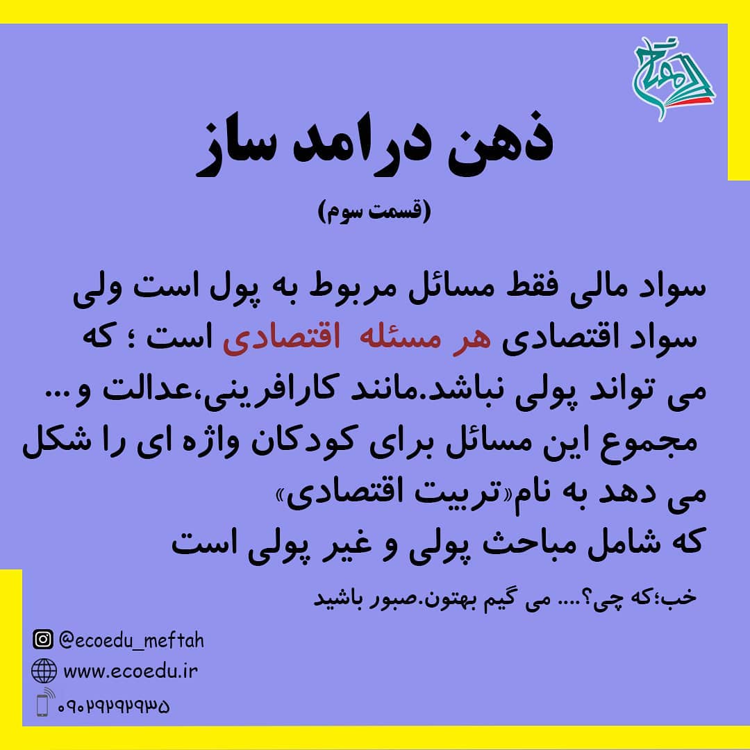 💎 در واقع تربیت اقتصادی وقتی است که ما سواد اقتصادی رو در روند رشد بچه ها به کار می گیریم! . و یک استاندارد جهانی است. . در ادامه آموزش ها یکی از موضوعات مهم تربیت اقتصادی رو باهم بررسی می کنیم. . حتتما همراه ما باشید😍✌ . ◀مفتاح؛موسسه فرهنگی هنری تربیت اقتصاد حکیم @ecoedu_meftah @ecoedu_meftah @ecoedu_meftah #درامد#درامدی#اقتصادی#تربیت_اقتصادی#اقتصاددان#سواد_مالی#سواد_اقتصادی#موسسه_تربیت_اقتصاد_حکیم#مفتاح