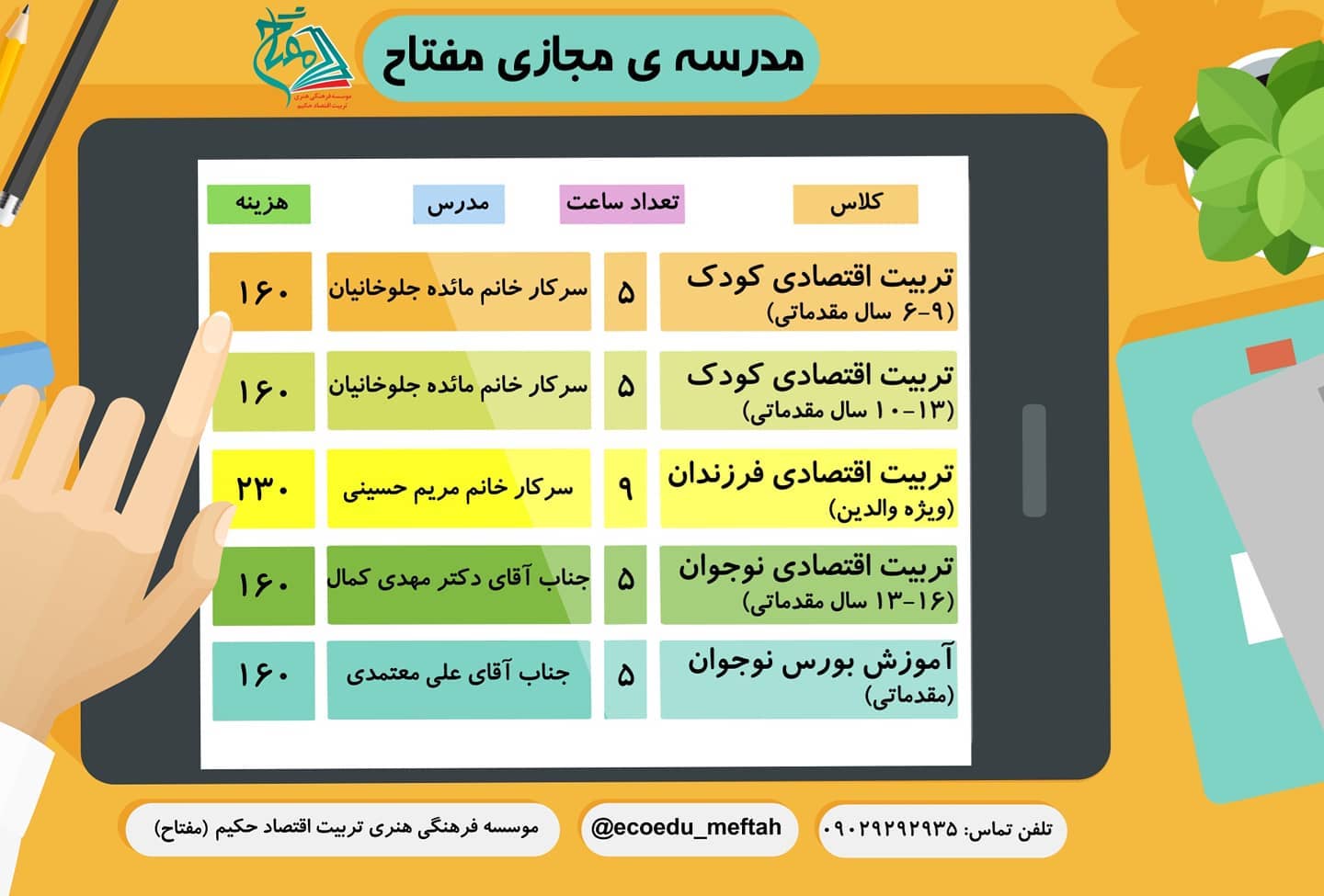دومین دوره از کلاس های مجازی سواد مالی و اقتصادی موسسه مفتاح ویژه کودکان و والدین😍😍😍 . ✔دو کلاس تربیت اقتصادی ویژه کودکان در دو رده سنی ۶تا۹ و ۱۰ تا۱۳ سال هر کدام ۵ جلسه یک ساعتی . ✔یک کلاس ویژه والدین ۶ جلسه یک و نیم ساعتی . ✔ کلاس تربیت اقتصادی ویژه نوجوانان ۵ جلسه یک ساعتی . ✔کلاس بورس نوجوانان ۵ جلسه یک ساعتی . روز و ساعت کلاسها در تصاویر بعدی قرار داده شده😊 سرفصل های اموزشی رو هم براتون استوری میکنم🤩🤩🤩 .مدرسین فوق لیسانس یا دکتراهای اقتصاد دانشگاه اصفهان هستند. . شروع کلاس ها 15اذرماه نکته: کلاس ویژه مربیان ان شاالله در زمستان برگزار می شود. 👈👈ثبت نام 24ساعت اول20درصد تخفیف 👈👈تا 72 ساعت بعد 15 درصد تخفیف . نکته مهمممم:👈ثبت نام در دو کلاس یا بیشتر دارای ۲۵ درصد تخفیف است😍😊 . ✔✔✔✔✔فرصت را با این تخفیف های ویژه و استثنایی از دست ندهید😀 😎😎آینده مالی فرزندانتان به تصمیم اکنون شما بستگی دارد! برای ثبت نام به دایرکت پیام دهید یا با شماره نوشته شده از طریق تماس، پیام یا "واتساپ" ارتباط بگیرید. 090 29 29 29 35 . دیگران را مطلع کنید.😊🙏 . 🔘مفتاح؛موسسه فرهنگی هنری تربیت اقتصاد حکیم @ecoedu_meftah #کلاس#کلاس_مجازی#کرونا#سواد_مالی#سواد_اقتصادی_کودک#کلاس_تربیتی_تربیت_دینی#کلاس_تربیت_کودک#کلاس_نوجوانان #سواد_اقتصادی_نوجوان#اقتصاد_را_از_کودکی_فرهنگ_سازی_کنیم #مفتاح#بورس#بورس_نوجوان#تربیت_اقتصادی_نوجوان#