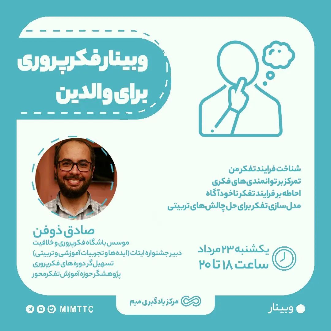 . فرایند تفکر من چگونه است؟🧐 چطور از نوع فکرکردن برای پیداکردن راهحل استفاده کنم؟🤔 همیشه امکان این نیست که ما به مشاوره مراجعه کنیم، کتابهای تربیتی هم که وجود دارد، مسائل را معمولا بهصورت کلی تبیین میکنند. من به عنوان «والد» با مشکلاتی مواجه هستم که نمیدانم چطور میتوانم آنها را حل کنم؟🤷🏻♀️ . در وبینار فکرپروری برای والدین که مقدمهای است برای آشنایی با دورهٔ فکرپروری برای والدین، باحضور صادق ذوفن، مدیر و مؤسس باشگاه فکرپروری و خلاقیت قرار است به این سوالها بپردازیم.🙂 . برای کسب اطلاعات بیشتر و ثبتنام به دایرکت یا سایت میم مراجعه کنید. . لینک ثبتنام https://mimttc.ir/?p=3843 . #فکر #تربیتی #تربیت_فرزند #والدگری #وبینار #فرزند_پروری #خلاقیت #تفکر_خلاق #تفکر_نقاد