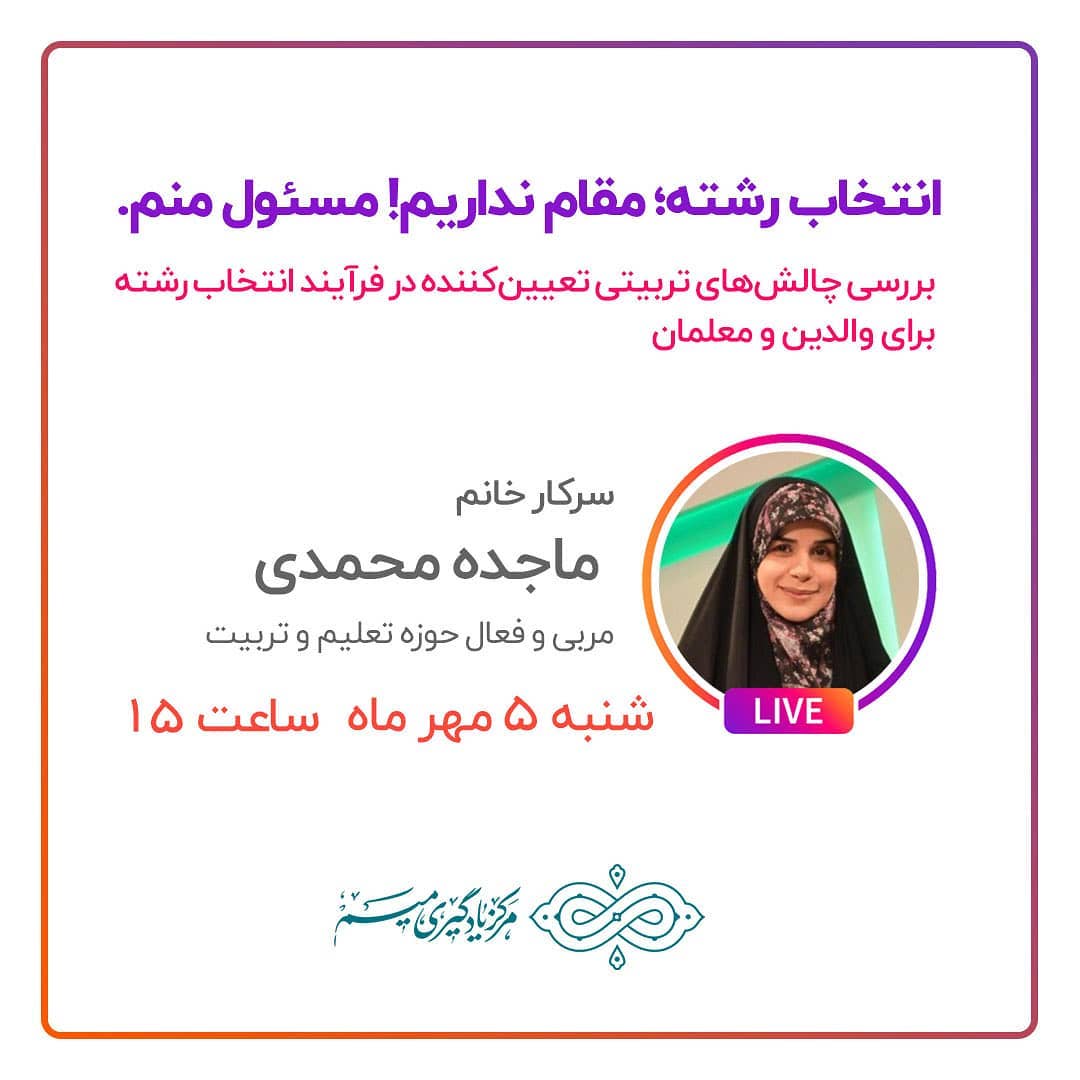 . روز شنبه ۵ مهر ساعت ۱۵ در مصاحبهی زندهی اینستاگرامی با سرکار خانم محمدی، به بررسی چالشهای تربیتی موضوع انتخاب رشته برای والدین و معلمان خواهیم پرداخت. با ما همراه باشید. #انتخاب_رشته #دانشگاه #رشته #کنکور #مسئولیت #تحصیل #دخالت_خانواده