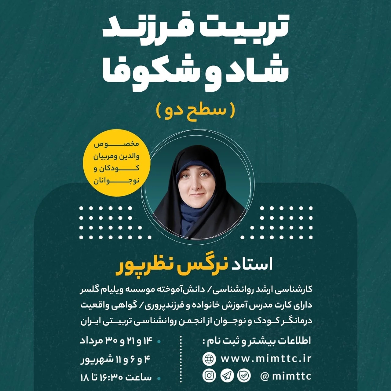 هشدار⛔⛔ این دوره ممکن است تمام باورهای شما در رابطه با #تربیت_فرزند را زیر و رو کند!! پس از برگزاری دورهی #تربیت_فرزند_شاد_و_شکوفا سطح یک ⭕حالا با دوره دوم همین کارگاه درخدمتتون هستیم😊 با سرفصلهای زیر: * چطور در خانه #انضباط را برقرار کنیم؟ * چطور کودکی #مسئولیت_پذیر نسبت به خود و جامعه تربیت کنیم؟ * چگونه #عزت_نفس و #اعتماد_به_نفس کودکم را افزایش بدهم؟ * به عنوان والد، #خشم خودمان را چطور مدیریت کنیم؟ * کودک من به چه طریق #عشق را دریافت خواهد کرد؟ * چگونه با کودک خود #صحبت کنیم؟(زبان#تئوری_انتخاب) 🔸شما صرفا شنوندهی چند نکته نخواهید بود، با فراگیری و اشتراکگذاری ایدههای خودتان در تربیتِ فرزند، رویدادی جدید و منحصر به فرد را از یادگیری تجربه کنید. . . مخاطب این دوره #والدین و #مربیان فعال در حوزه آموزش خانواده هستند. این دوره به شیوهی #مشارکتی و به صورت #آنلاین برگزار خواهد شد. صوت و ویدئوی کارگاه پس از هر جلسه در اختیار شرکت کنندگان قرار خواهد گرفت.🌸 . . 📜اعطای گواهینامهی شرکت در کارگاه از طرف #مرکز_یادگیری_میم و #موسسهٔ_تبیان برای مربیان مدارس . 📎برای ثبت نام به سایت مرکز یادگیری «میم» مراجعه فرمایید: https://mimttc.ir/?p=1869